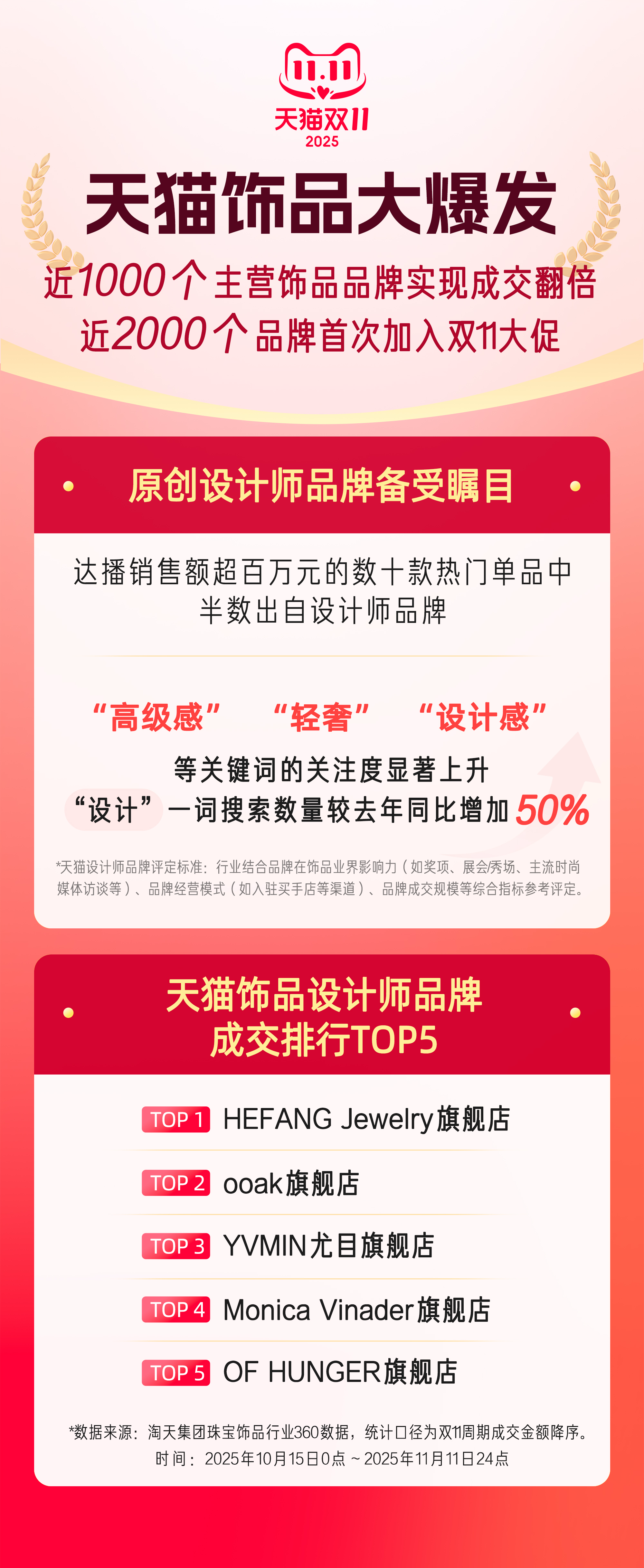 天猫饰品负责人表示:“我们注意到消费者对原创设计的需求正在快速增长。为此,平台今年加大了对设计师品牌的扶持力度,通过‘超级首饰发布’行业IP、流量资源倾斜、直播合作等方式,助力原创品牌成长。”
