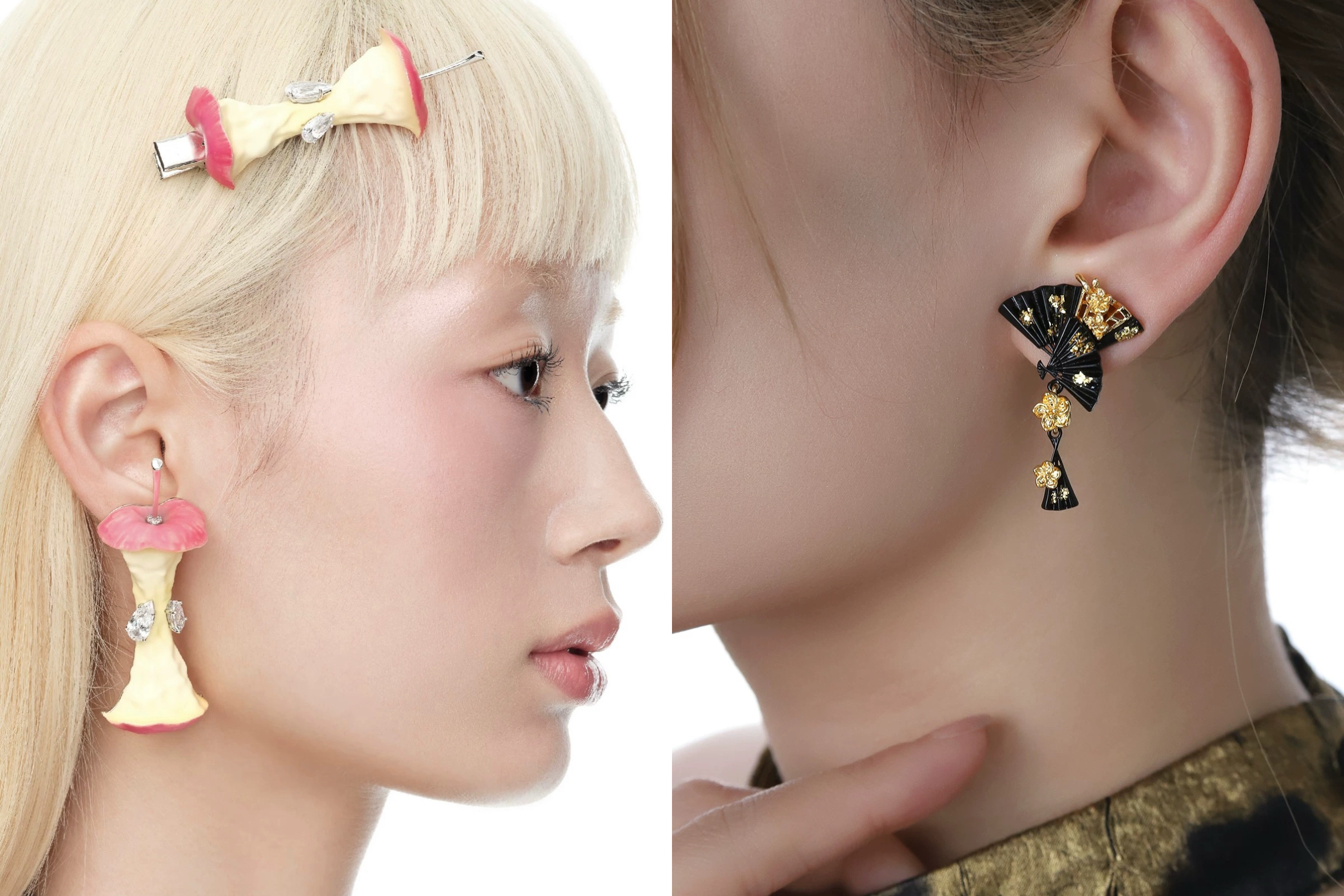 例如,HEFANG与华为合作的耳夹耳机,巧妙将科技产品转化为耳畔的低调配饰;主打“梦幻与叛逆共生”的尤目,用苹果核和苹果皮做成发卡、发箍,赢得大批鬼马少女的青睐;而麻秀则将梅花、折扇等古典元素融入耳钉设计,展现出新中式风格的持续影响力。