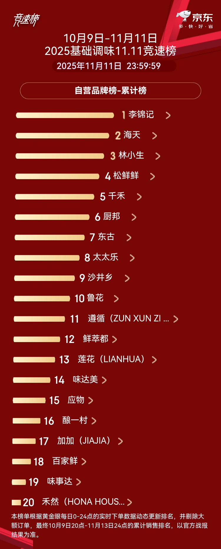 京东今年推出长达37天(10月9日至11月14日)的超长“双11”活动期。其竞速榜是品牌实力的直接体现。京东自营数据显示,在大促周期内,林小生高居榜单第三位,与李锦记、海天位列第一阵营。其旗下多款旗舰产品“100%蚝汁蚝油”“90%无麸质蚝汁蚝油”“70%蚝汁蚝油”的销售额均实现大幅增长。