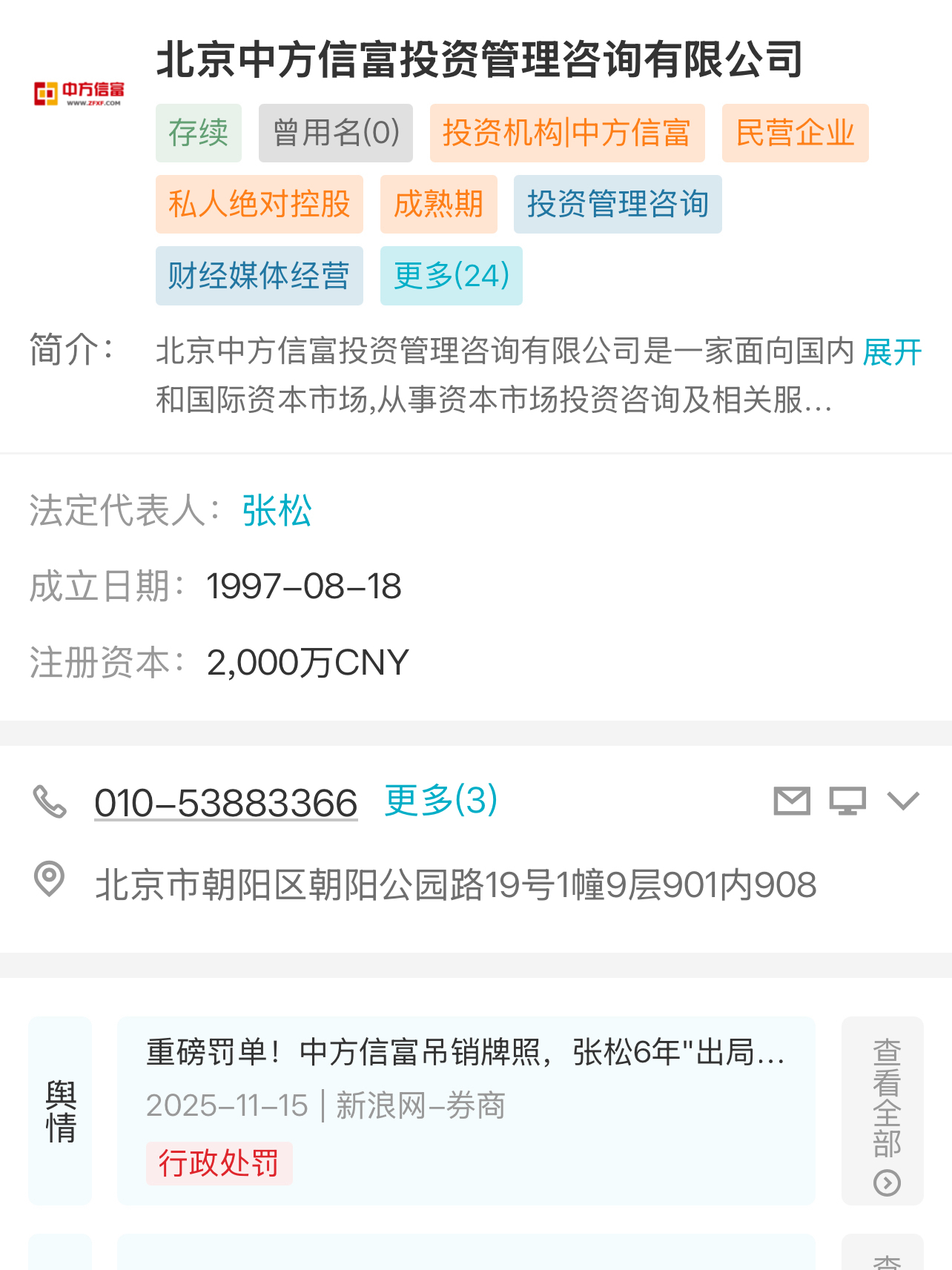 2020年2月27日,北京证监局对中方信富出具《关于对北京中方信富投资管理咨询有限公司采取责令暂停新增客户监管措施的决定》,责令中方信富全面整改,暂停新增客户六个月。