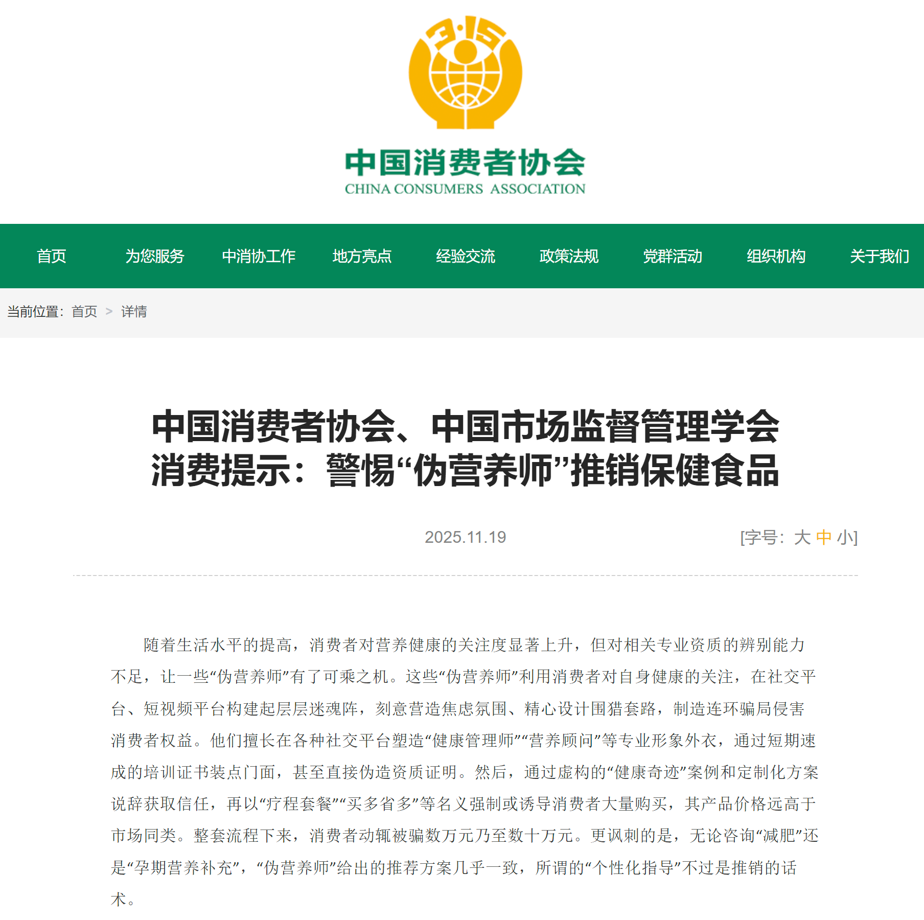 11月19日,中消协官网信息显示,中消协和中国市场监督管理学会联合发布消费提示,提醒消费者警惕“伪营养师”推销保健食品。