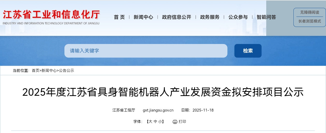 根据江苏省工业和信息化厅、省财政厅《关于组织2025 年度江苏省具身智能机器人产业发展资金项目申报的通知》(苏工信综合〔2025〕287号),经规定程序,拟支持 7个具身智能机器人相关项目,现予公示,公示期截至2025年11月24日。记者梳理发现,南京、无锡 、苏州各有 2 个入选,宿迁 1 个。