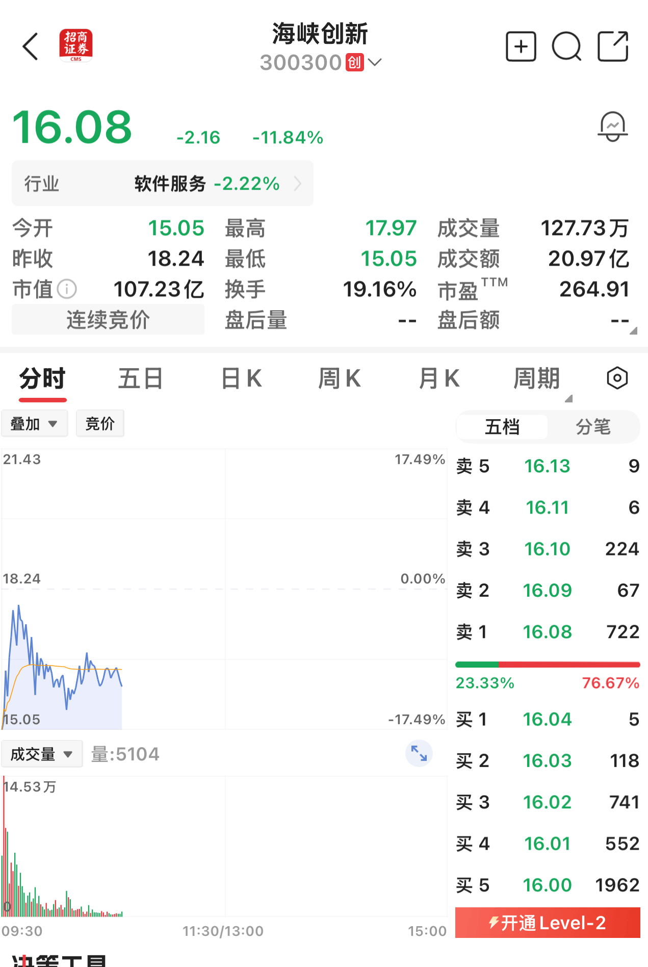 11月17日,海峡创新股价大涨20%,最新市值为122亿元。