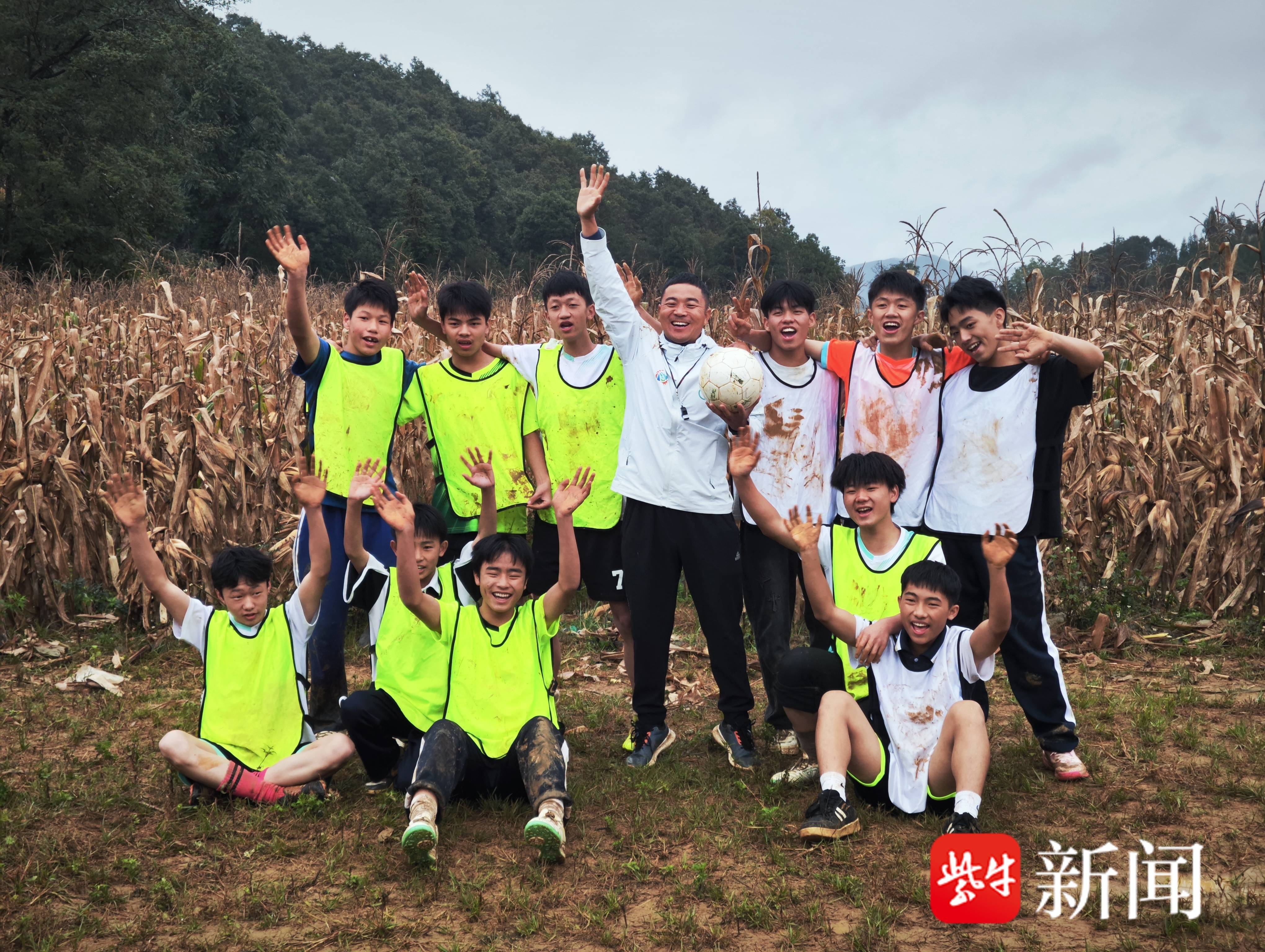 欧阳谦校长和学生们在玉米地足球场上