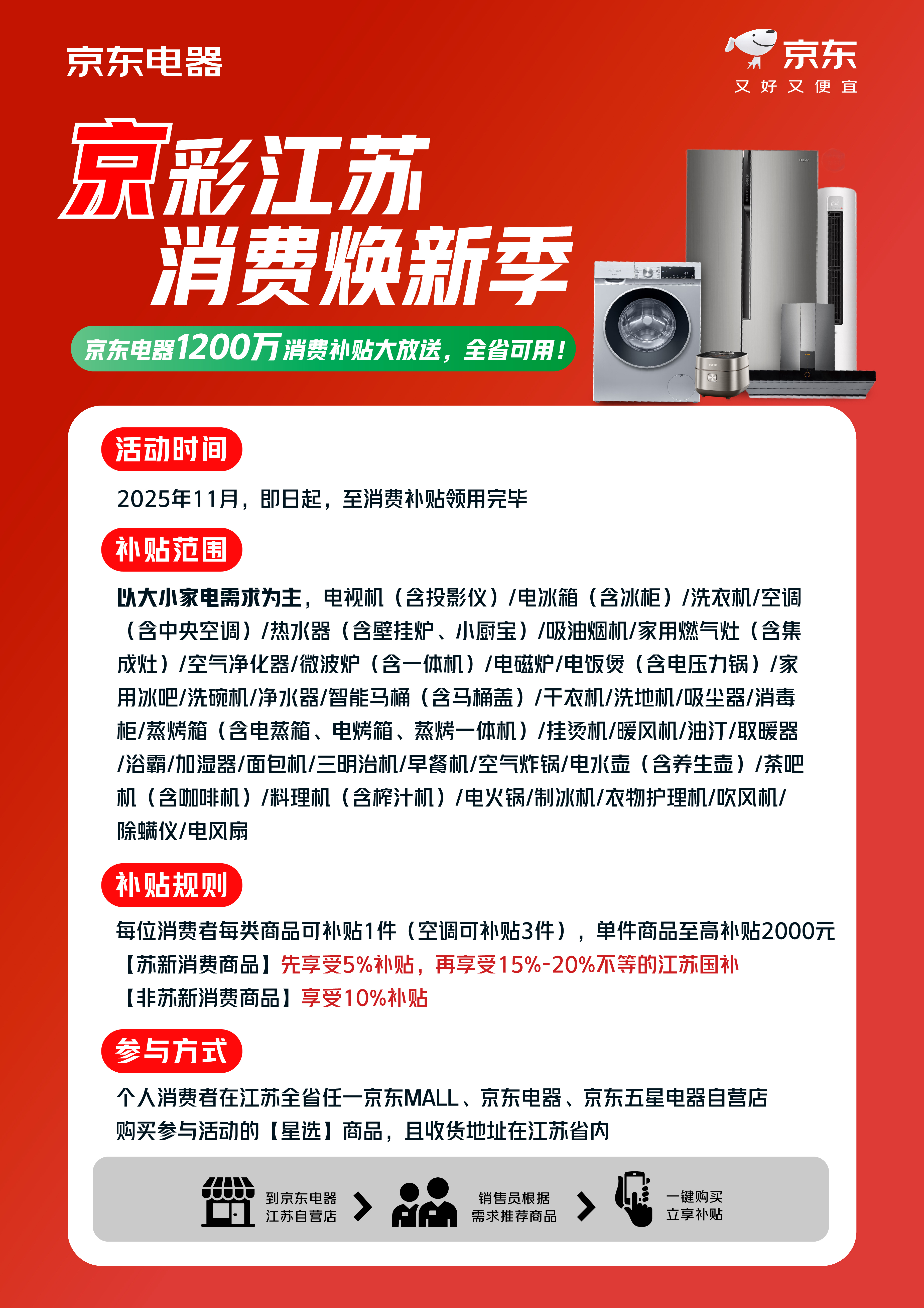 即日起至补贴额度用完,消费者在京东MALL、京东电器、京东五星电器江苏省内近130家自营门店,购买指定型号的空调、冰箱、洗衣机、干衣机、洗碗机、清洁电器、电火锅、取暖器等39类家电,可享双重补贴:符合苏新消费商品池的商品叠加5%“京彩江苏”补贴与15%-20%江苏国补(以能领取到国补额度为准),其他符合要求的商品直接享10%“京彩江苏”补贴。单件商品最高补贴2000元,个人消费者每类可购1件(空调3件),收货地址需在江苏省内。以美的400升一级能效十字门冰箱为例,市场价3499元,叠加补贴后仅需2203元;小天鹅某款2499元的10公斤滚筒洗衣机补贴价1747元;科沃斯扫地机器人从2999元补贴后仅售2421元。京东电器表示,补贴聚焦西门子、美的、海尔等知名品牌的高性价比机型,切实减轻居民焕新压力。