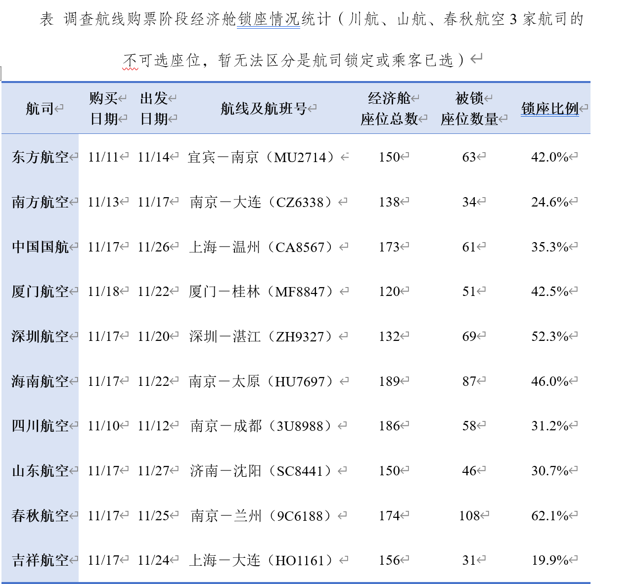 10家航司经济舱均存在锁座现象