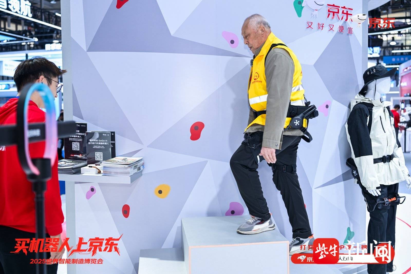 老人在京东展台体验外骨骼机器人