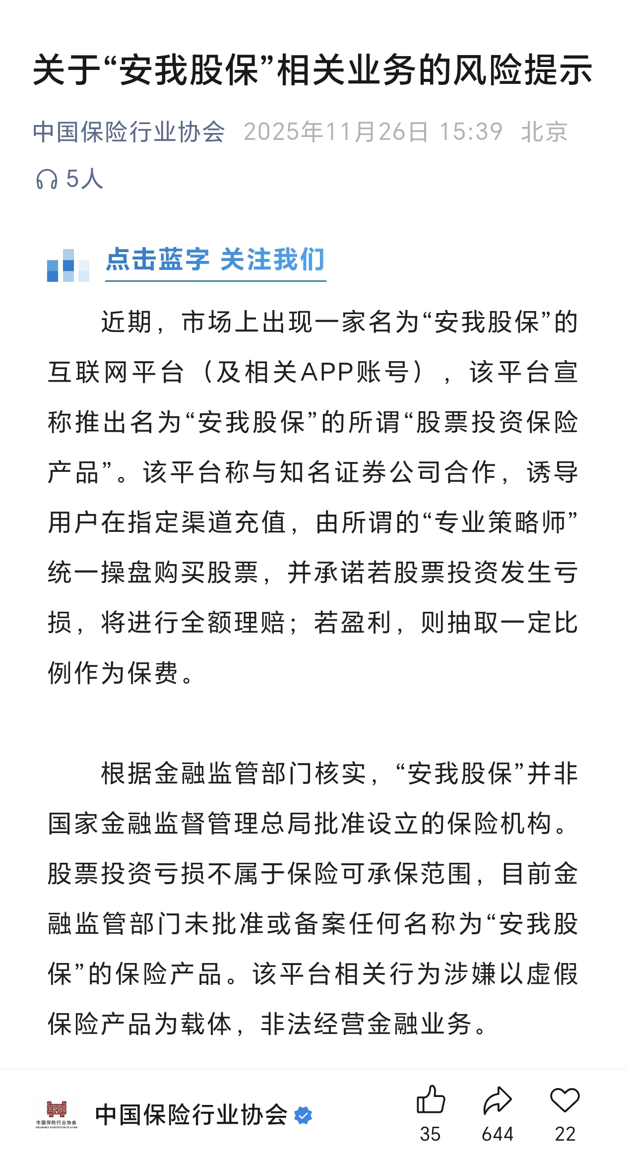 根据金融监管部门核实,“安我股保”并非金融监管总局批准设立的保险机构。股票投资亏损不属于保险承保范围,目前金融监管部门未批准或备案任何名称为“安我股保”的保险产品。该平台相关行为涉嫌以虚假保险产品为载体,非法经营金融业务。
