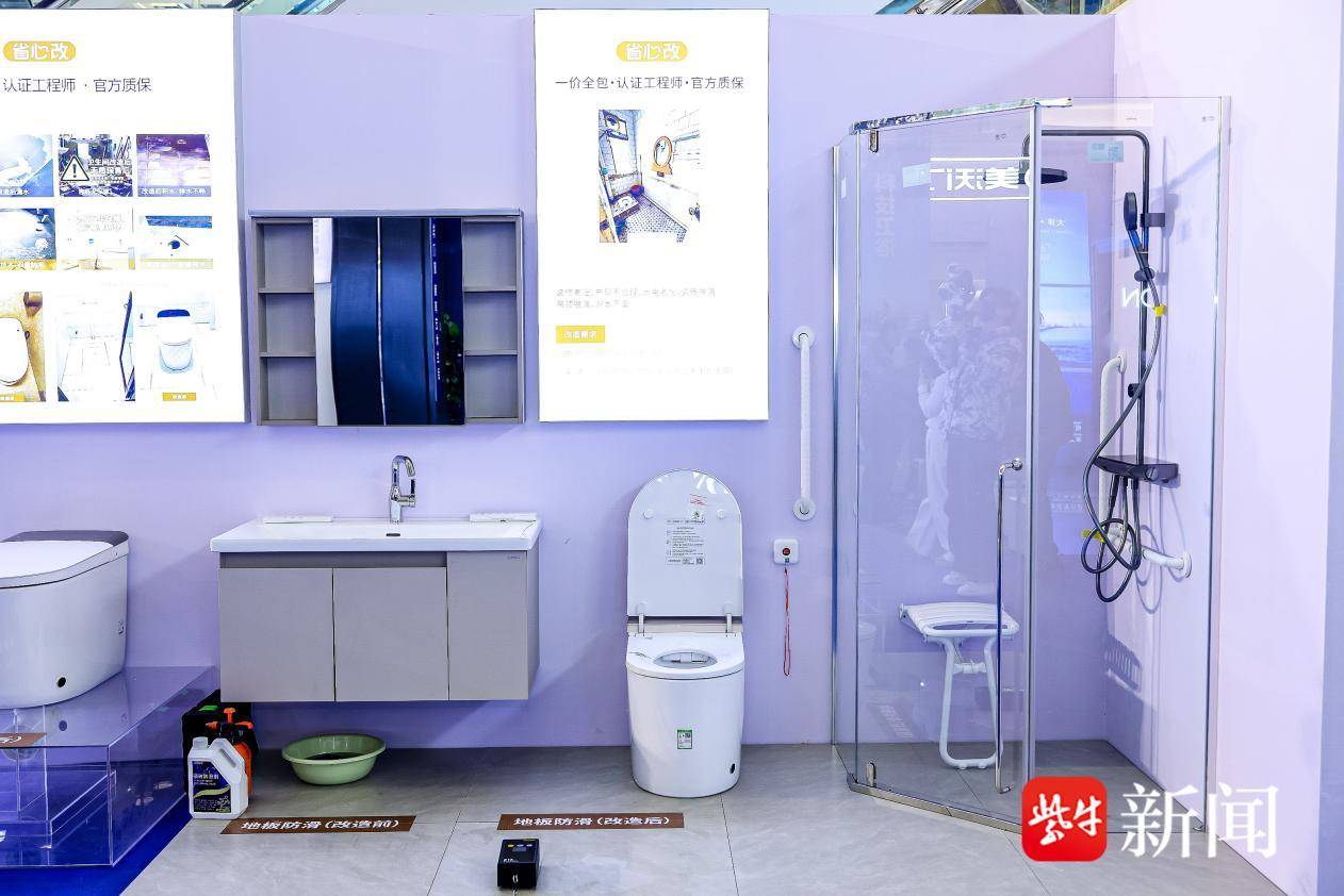 洗漱场景中,针对不同房型用户的日常需求,“省心装”服务通过专业测量并进行量身设计,可定制对应尺寸、形状的浴室柜,安装时通过毫米级定位、无损切割、无尘切割等技术,安装更精准、更干净;“省心改”服务,可提供地排改墙排等排水改造,还有持国家电工认证的服务管家进行电路改造;“省心用”服务提供浴室柜台面和镜面清洁、排水管清洁及杀菌抑菌、专用防霉玻璃胶进行封边焕新服务。与此同时,考虑到南京城市的特殊性,这次行动还针对老幼孕等群体每年600万的卫生间摔倒事件,特别推出防滑改造“省心改”服务,环保防滑材料即改即用,可以5年强效防滑。