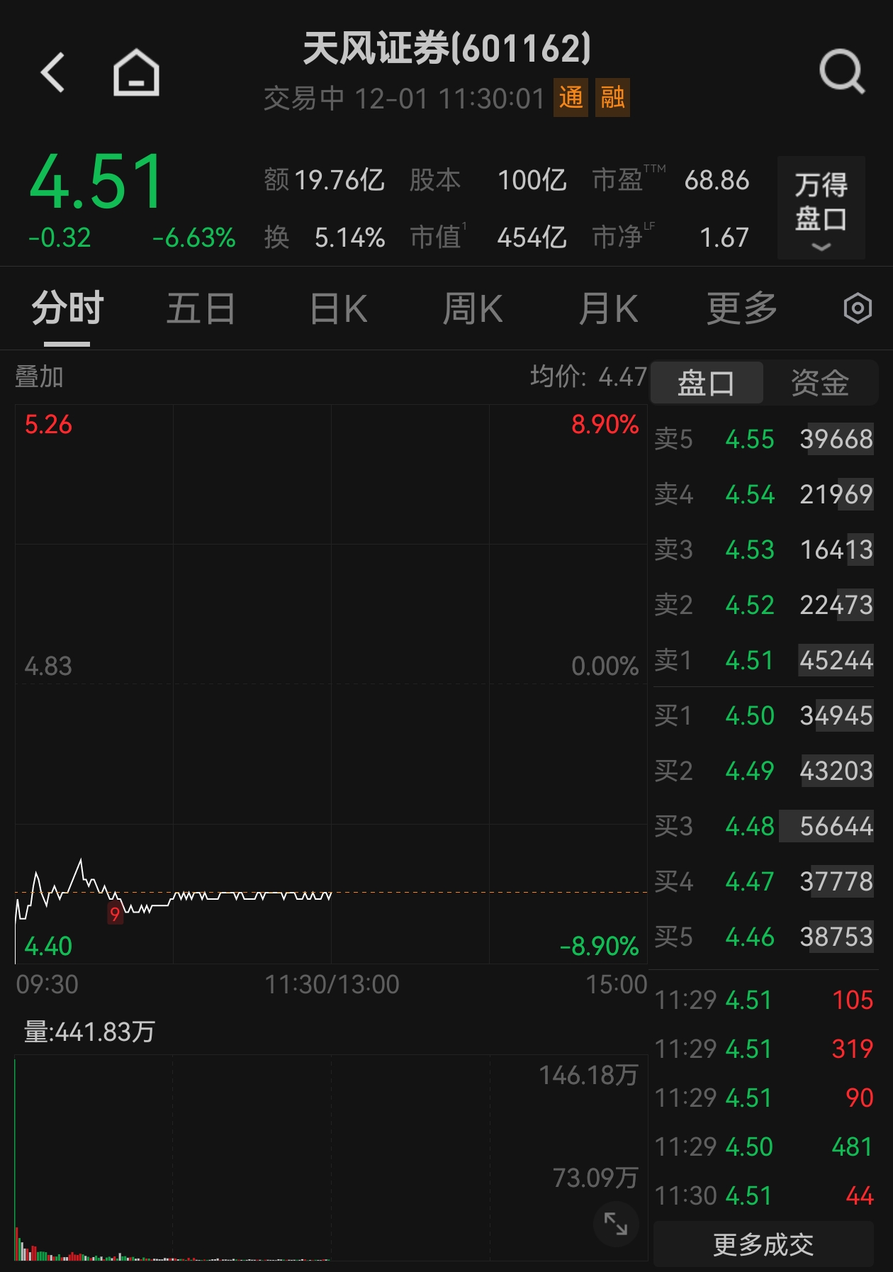 受立案调查消息影响,天风证券(601162.SH)周一开盘大跌。12月1日早盘,天风证券低开近9%,同时,券商板块个股涨多跌少,天风证券领跌。截至午盘,天风证券报4.51元/股,跌幅6.63%。