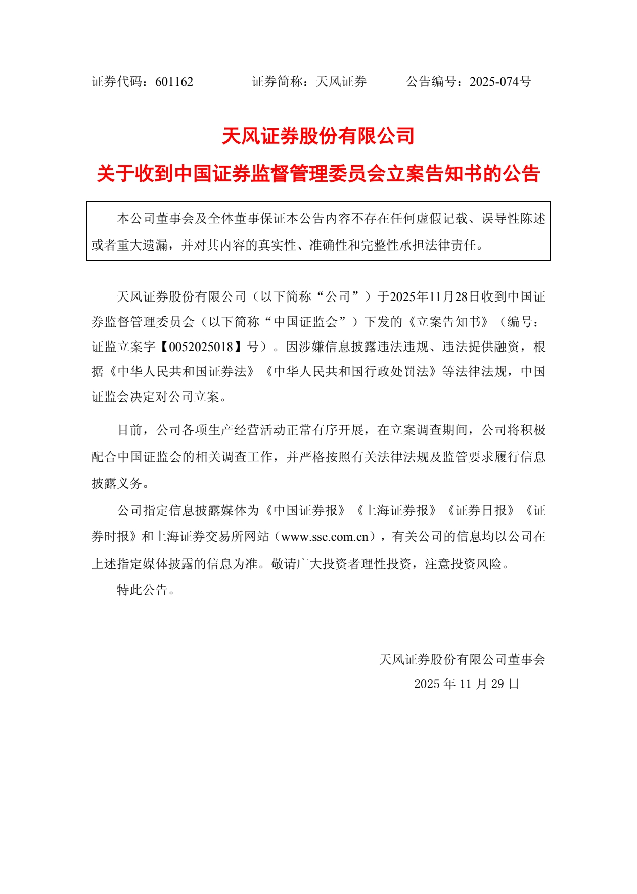 2025年11月28日晚间,天风证券(601162)收到中国证监会下发的《立案告知书》,因涉嫌信息披露违法违规、违法提供融资,中国证监会决定对公司立案。
