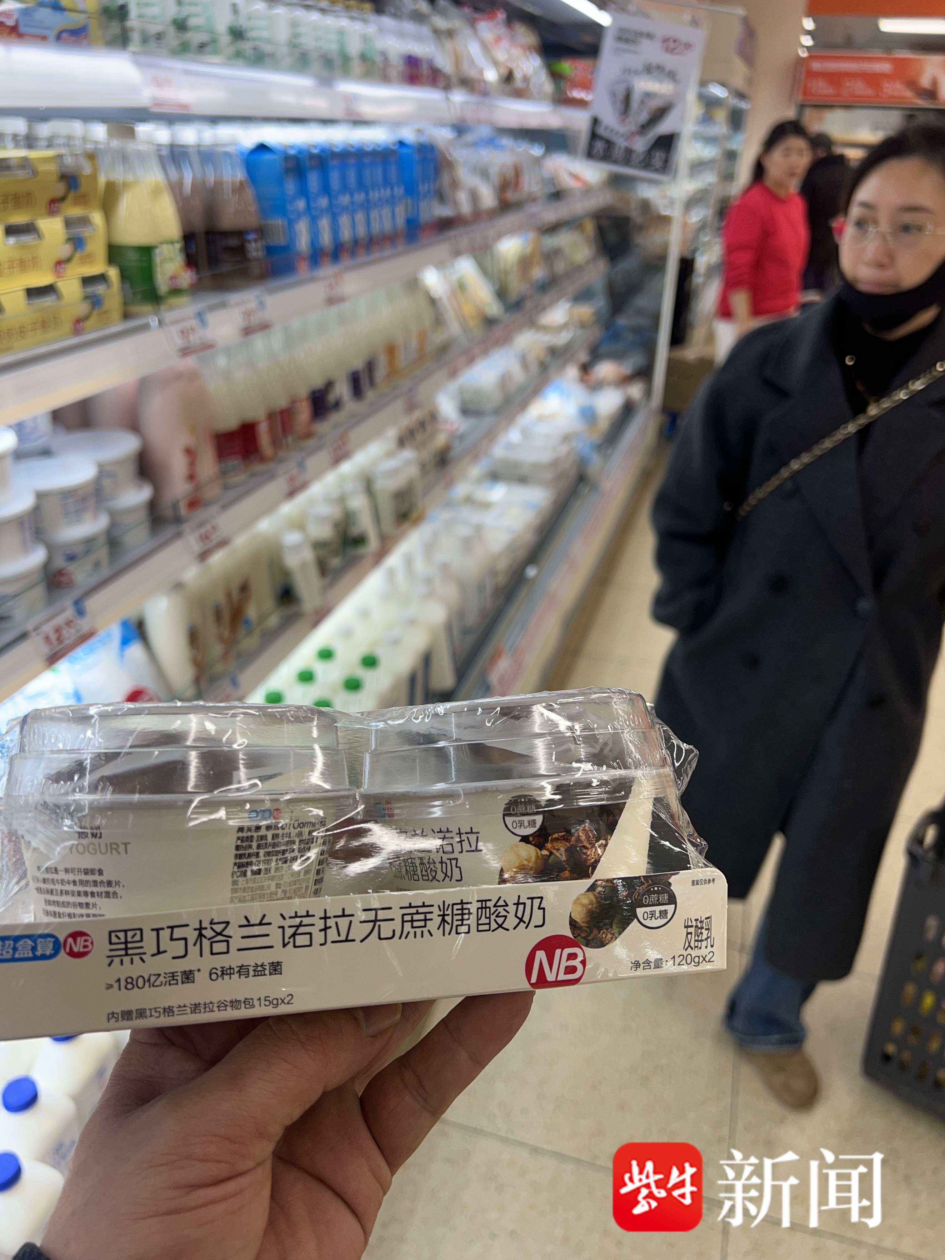 7日上午10时许,南京河西建邺万达广场盒马超市里,酸奶、乳制品、果蔬饮品、面点四个商品大类的专柜“比肩排列”,酸奶的商品有20种。