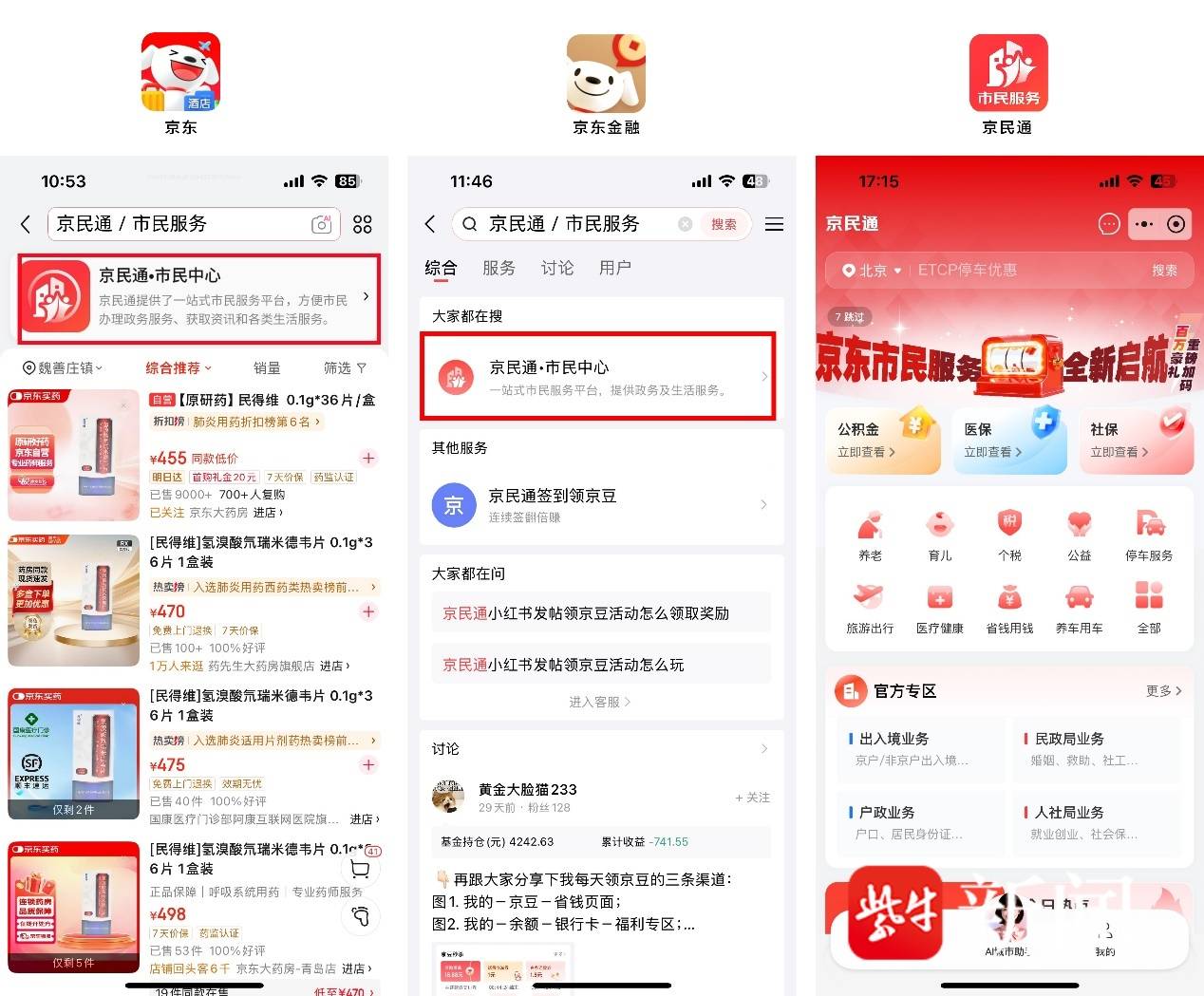 即日起,用户只需打开京东App或京东金融App,在首页搜索“京民通”或“市民服务”即可一键进入,轻松办理公积金查询、医保报销、社保缴纳、个税申报、育儿补贴申领、养老资格认证等高频政务事项。同时,平台还聚合了生活缴费、快递寄收、定点药店查询、旅游出行、求职就业等多元便民服务,真正实现“办事不出门、服务在指尖”。