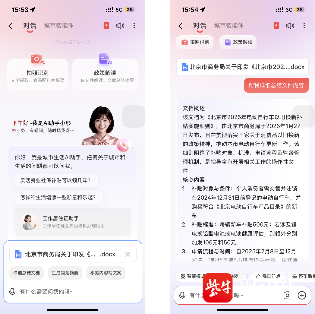政策解读:用户上传政府公告、办事指南等图片或文档,“AI助手小彤”可一键生成通俗易懂的政策解读、要点摘要和办理建议,大幅降低公众理解门槛。