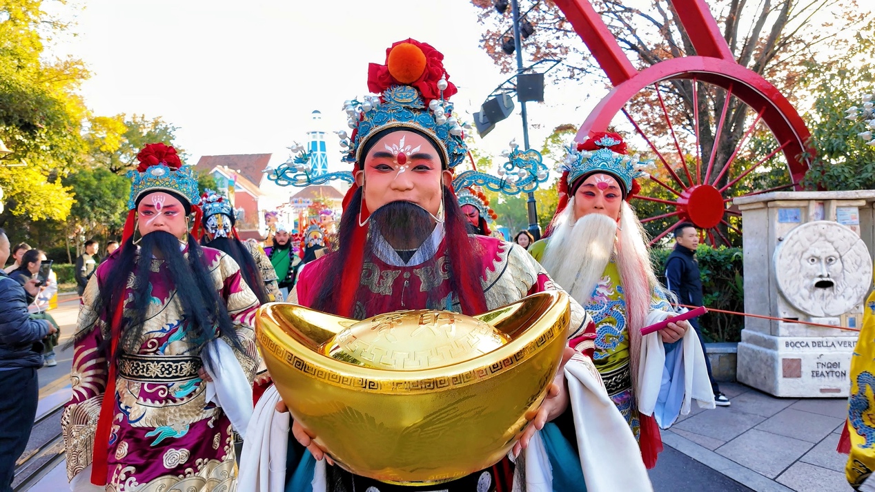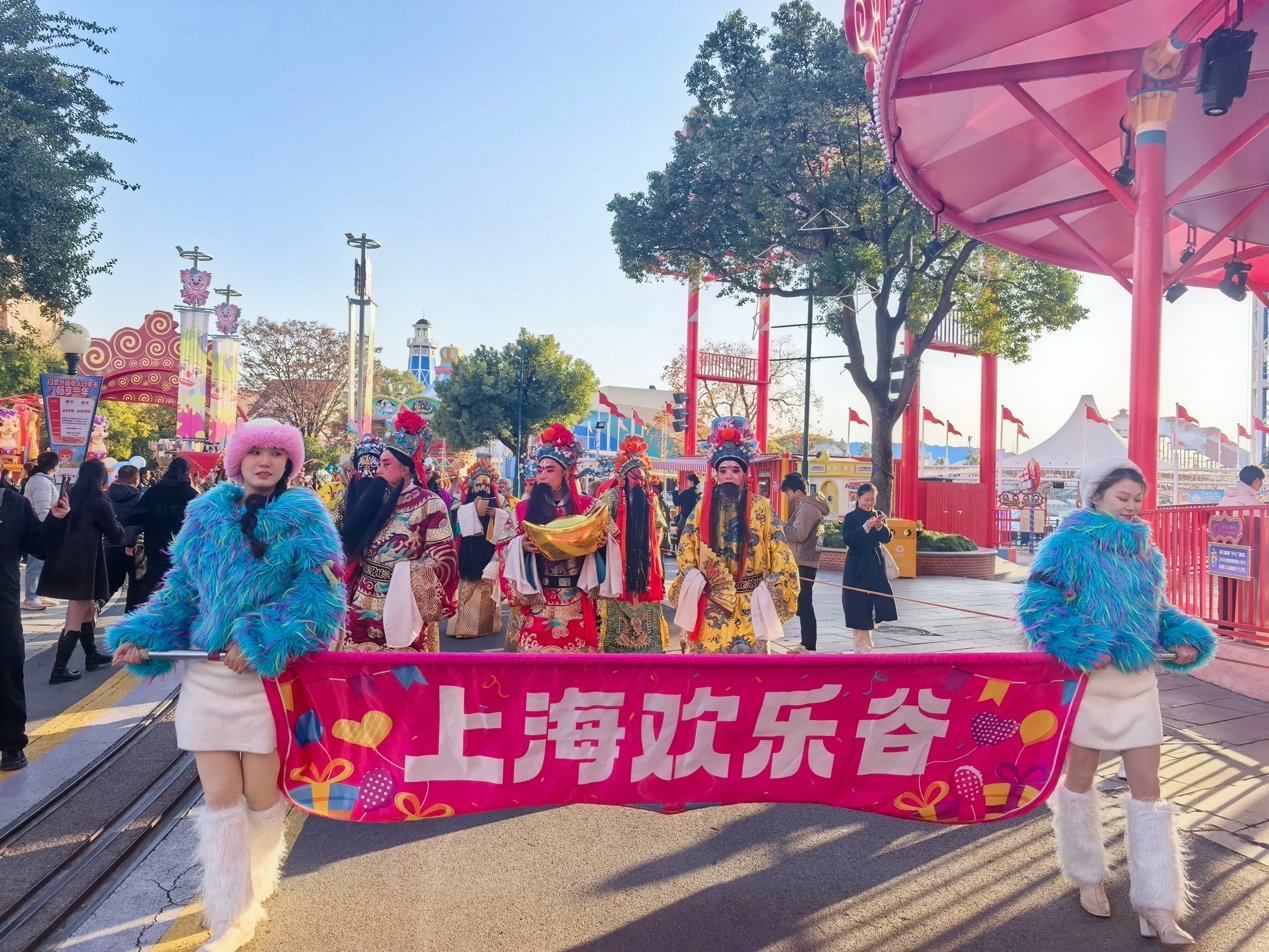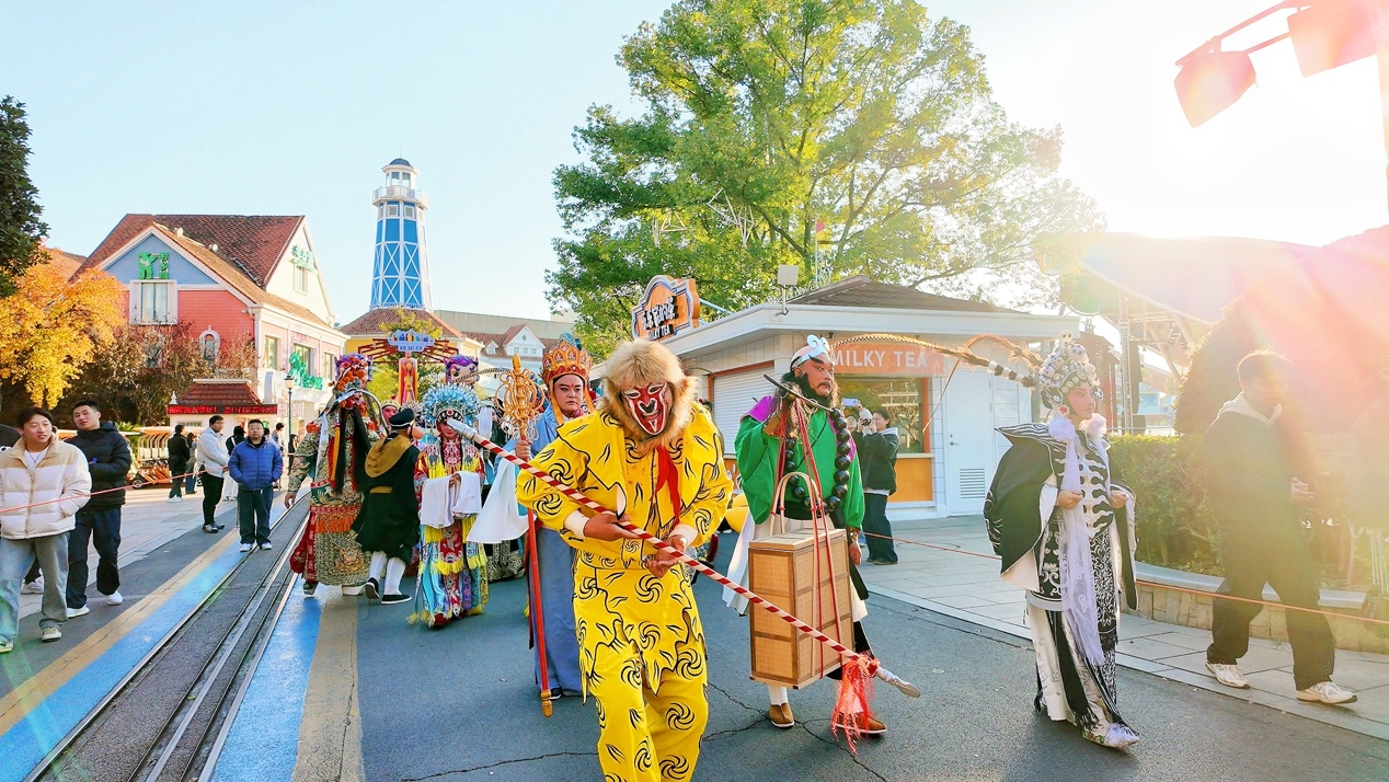 当天下午在欢乐谷的花车巡游中,秦腔元素再次成为焦点。剧团演员们化身财神、关羽、孙悟空等经典角色,身着精致戏服,在巡游过程中表演甩袖、亮相等基本功,与沿途的二次元coser互动合影。