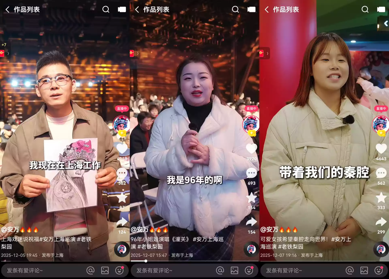 “让更多人尤其是年轻人了解秦腔、发扬秦腔,是我的梦想。”安万说。带着这个愿景,12月3日至7日,快手新知打造“安万上海巡演活动”,在为期5天的活动中,以2天的城市快闪、3天的公益演出等多元形式,完成了一次传统戏曲的破圈之旅。据悉,本次活动在@安万 的快手账号上全程直播,共收获4817万人次在线观看,相关短视频播放超过3.2亿次,而3天6场公益演出更收获了约5400人次的到场观看,其中超50%以上观众为年轻人。