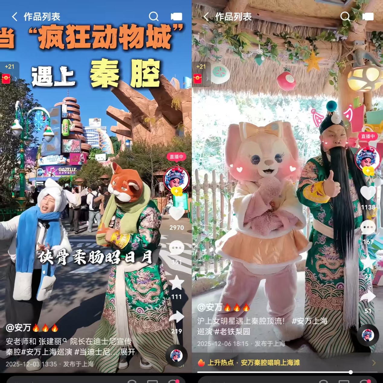 “狐兔同心天地鉴,情谊花好月又圆……”12月3日清晨,上海迪士尼乐园的卡通旋律中突然闯入一段激昂的秦腔——安万身着简洁戏服,在迪士尼即兴开唱,独特的声线瞬间吸引了大批游客。