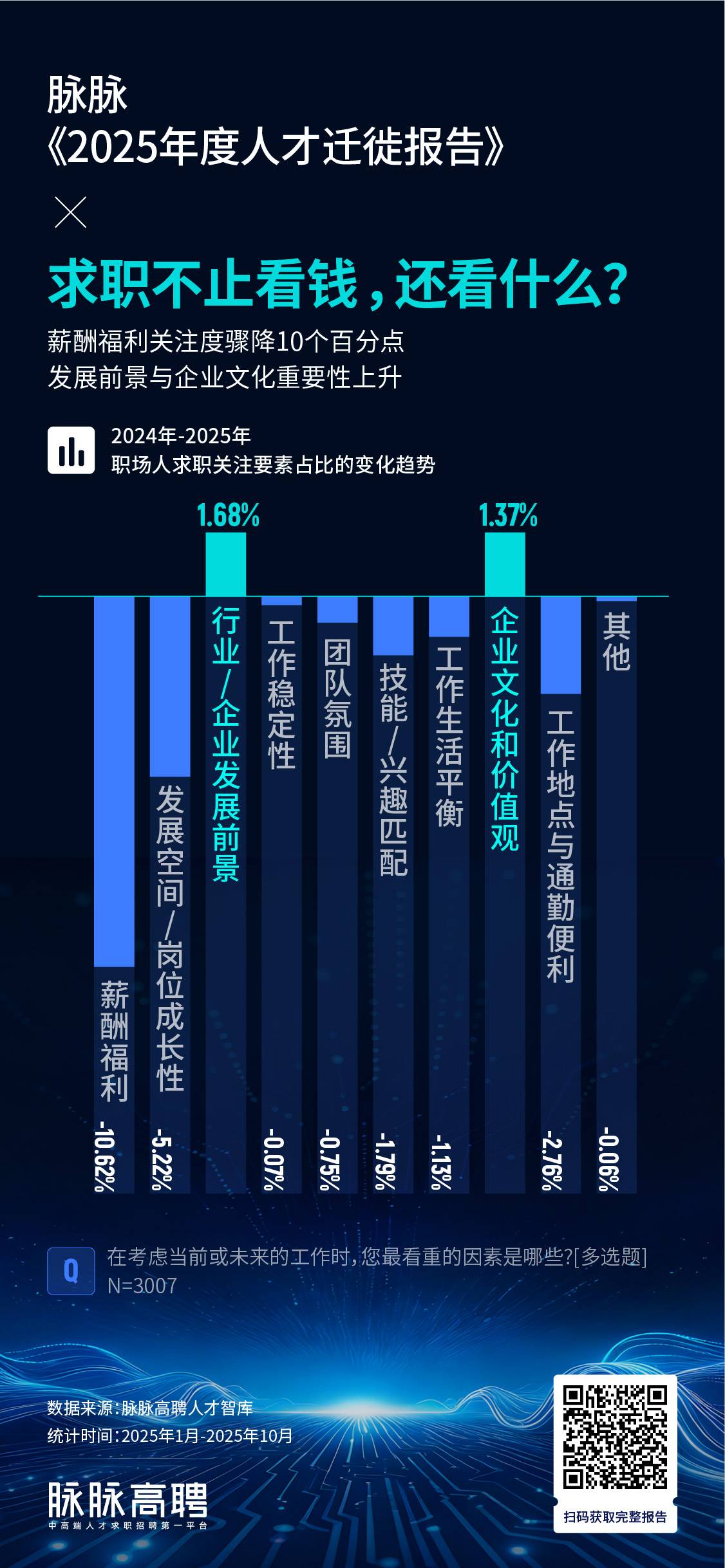随着招聘市场回暖,职场人的求稳心态出现松动。职业状态“没有变化”的人才占比从2023年的45.30%下降到2024年的41.41%,今年进一步下降至40.51%,“主动辞职”的人才占比显著上升,达到21.13%,较2023年提升8个百分点,较2024年提升2个百分点。