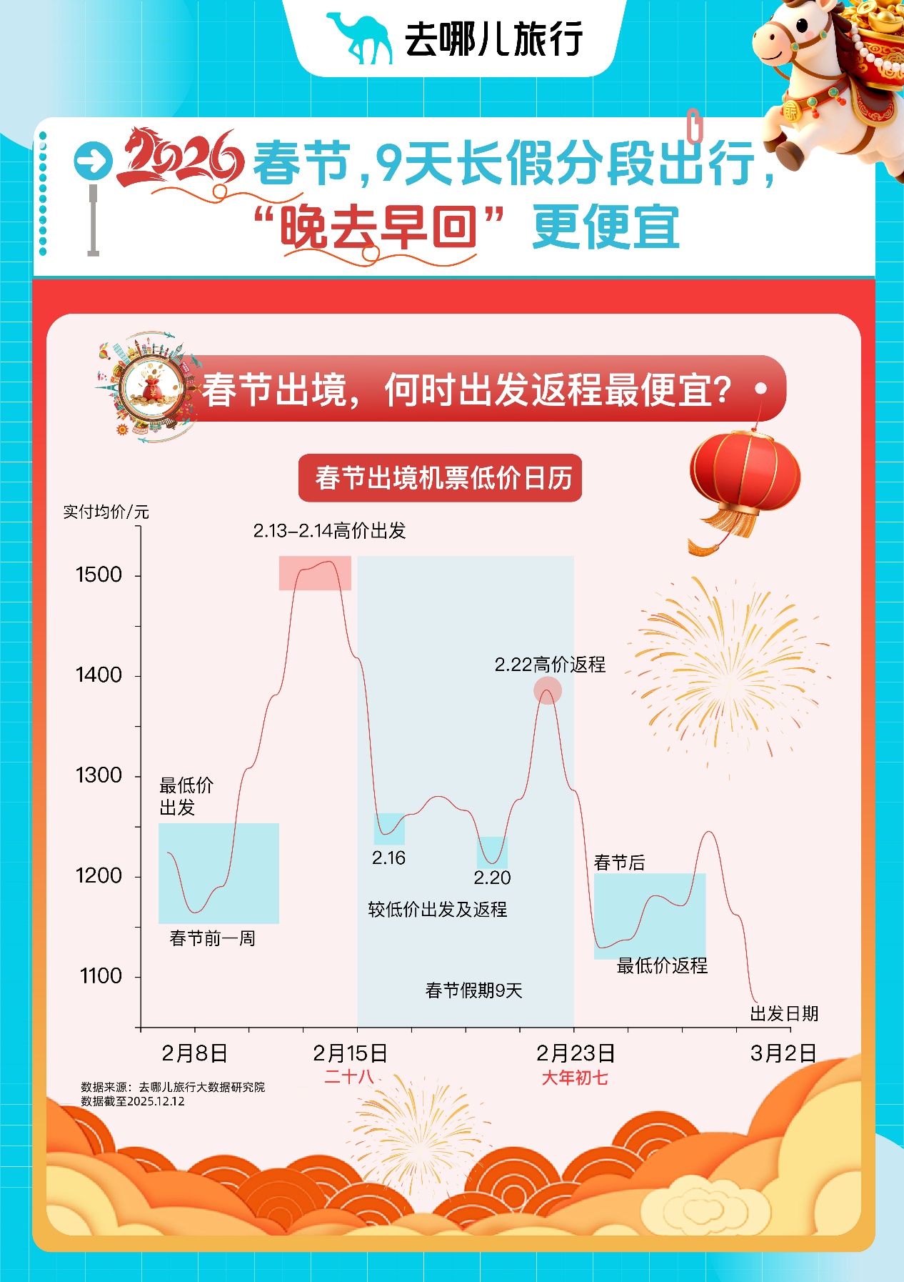 2026年春节假期长达9天,堪称“史上最长春节”,带动出境游热度超过2025年春节。去哪儿旅行数据显示,2026出境游机票酒店预订已经进入高峰。热门出境游目的地酒店预订量增长1倍以上;更多人选择在长假中分段出行,节前、节中出现两个出境高峰。也有人“拼假抢跑”,提前出发享受更优惠的票价。去哪儿旅行数据显示,春节假期前一周出境机票量就开始直线上升,机票价格是春节前夕出行的一半。