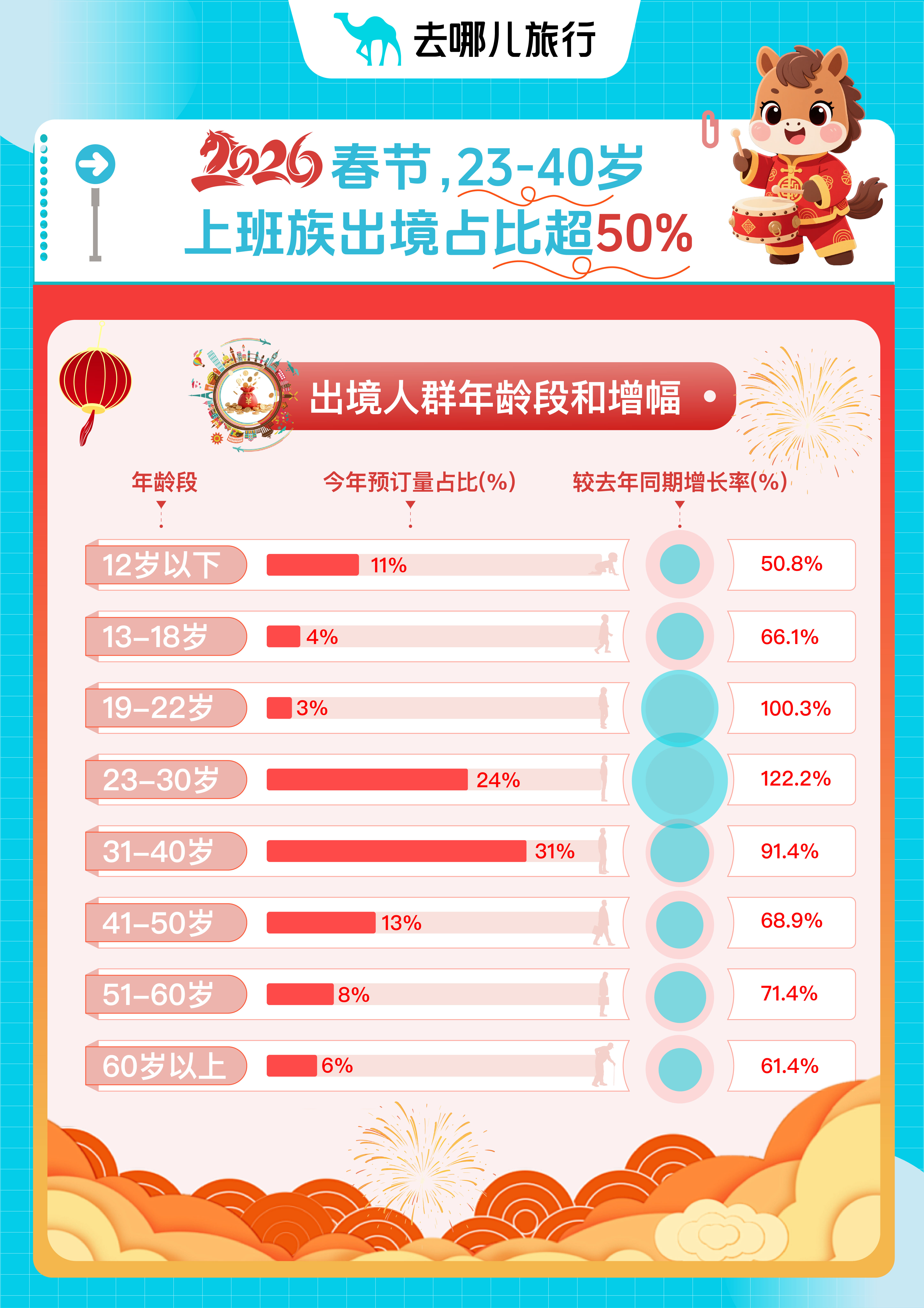 23-40岁上班族成为2026年春节出国游的绝对主力,该年龄段占比超半数,合计达55%。其中,消费能力与出行意愿兼具的31-40岁人群占比最高,达31%,同比增长9成以上;23-30岁年轻上班族增长最快,预订量增幅超1.2倍,成为拉动春节出国游市场增长的关键力量。