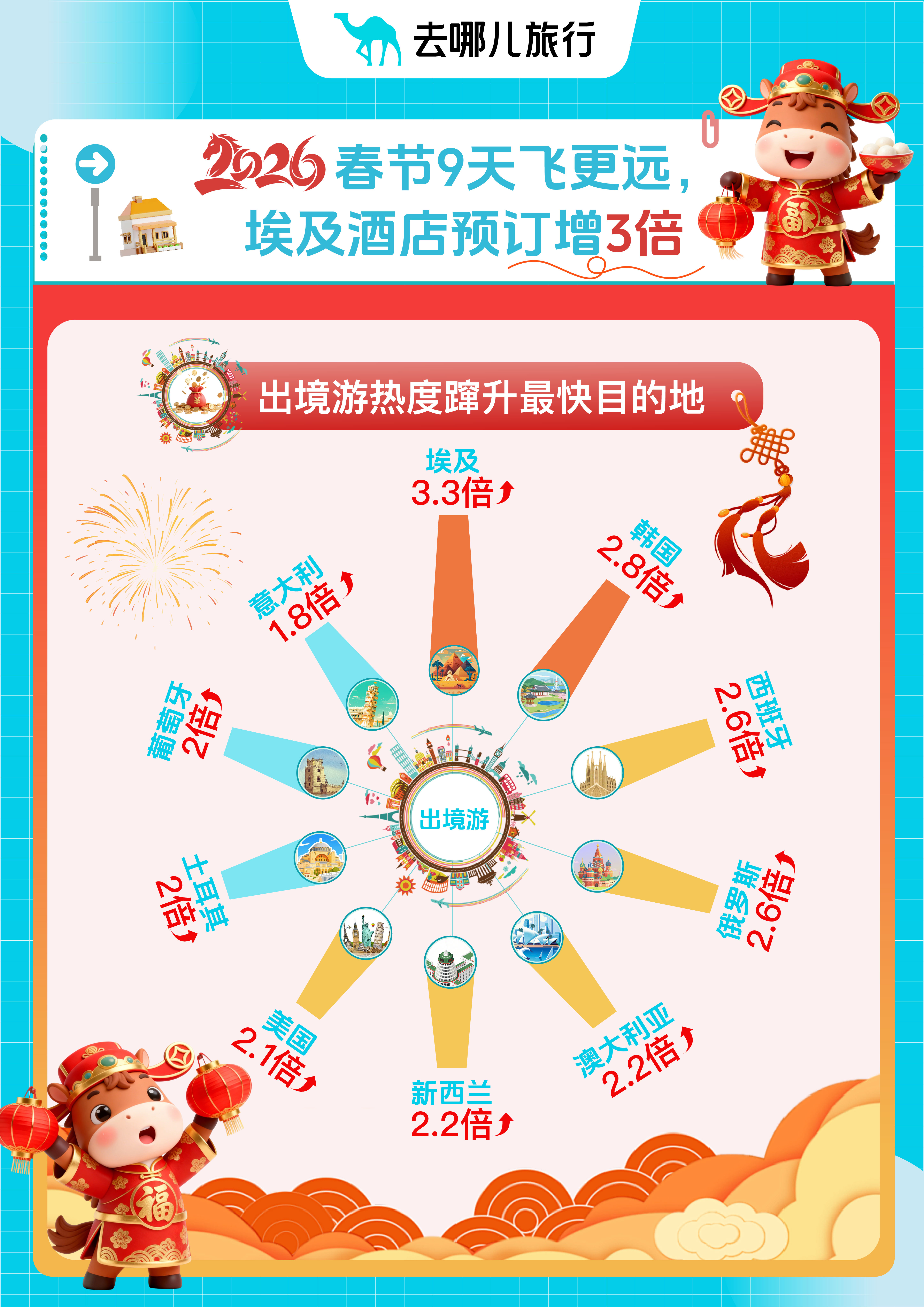 9天长假,“会玩儿”的人们也走得更远了。2026年春节出国游,长线目的地热度大幅攀升。据去哪儿旅行数据,热度蹿升最快的TOP10目的地中,除韩国外,均为较远目的地。其中,埃及酒店预订量增长3.3倍领跑,西班牙、澳大利亚、土耳其、葡萄牙等长线目的地的酒店预订量也增长超2倍。