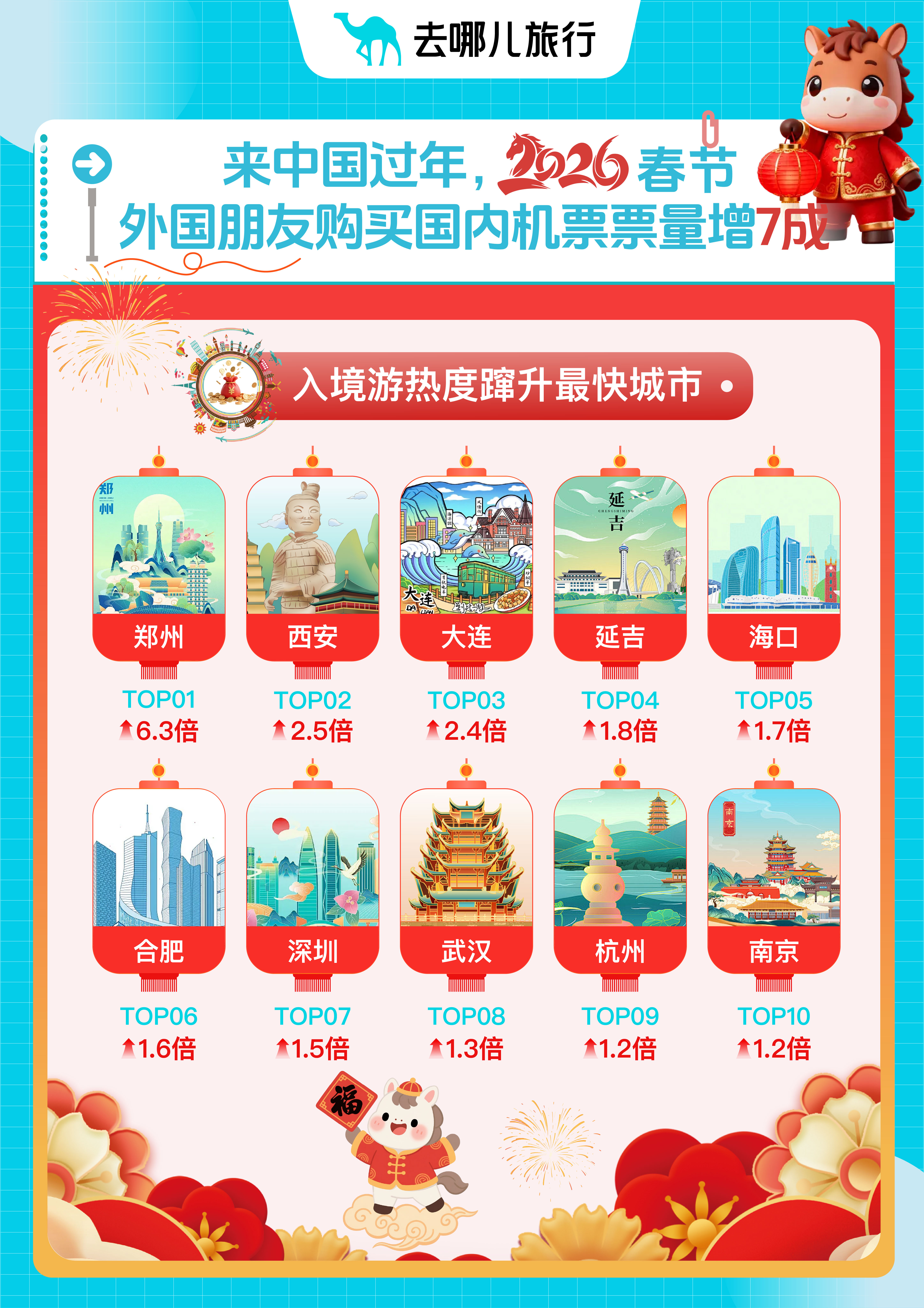 寒假+春节,“中国游”持续火热。2026年春节期间,在去哪儿旅行平台上,使用非中国护照预订国内航班的数量同比增长7成。
