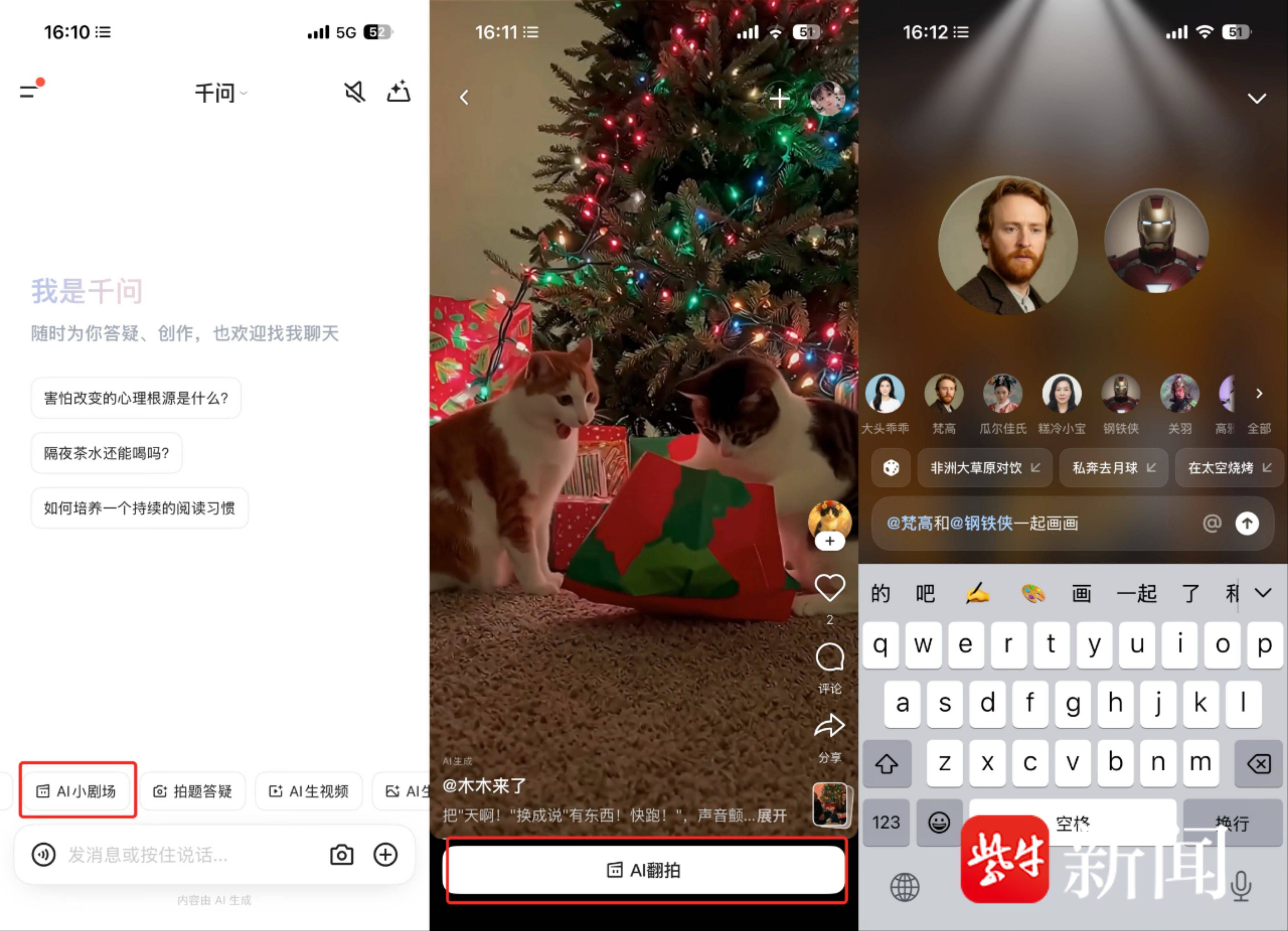 12月16日,阿里千问APP同步上线最新视频生成模型万相2.6,并向所有用户免费开放。基于该模型的核心能力,千问APP上线“AI小剧场”功能,在国内首次实现“角色合拍”玩法,用户可与朋友或名人轻松同框出演AI短片。