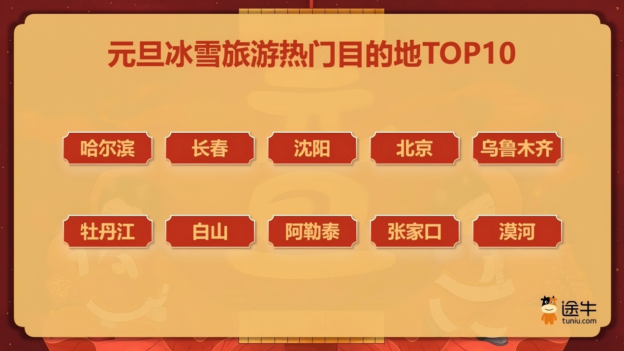 元旦假期冰雪旅游热门目的地方面,东北地区的哈尔滨、长春、沈阳、牡丹江、白山、漠河等,以及北京、张家口、乌鲁木齐、阿勒泰、呼伦贝尔等均位列“元旦假期冰雪旅游热门目的地榜单”前列。随着元旦假期的临近,预计冰雪旅游市场将在元旦假期迎来2025-2026冰雪季的首轮出游高峰。