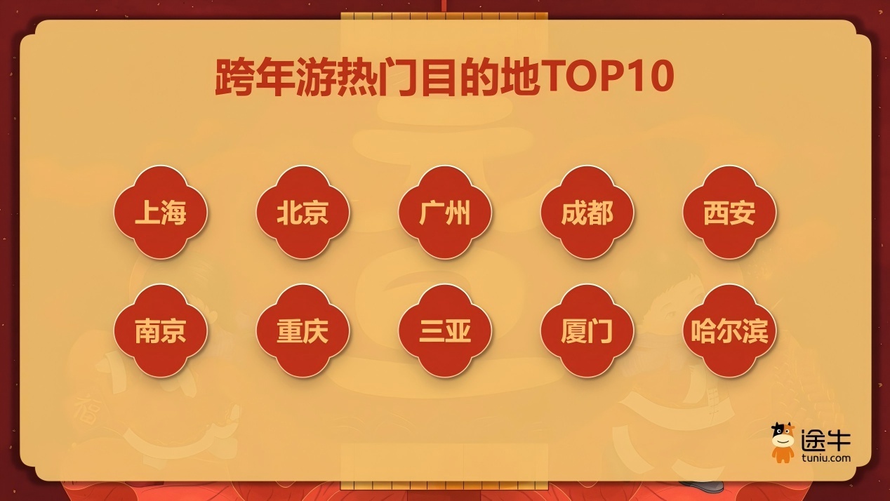 跨年游热门目的地中,上海、北京、广州、成都、西安、南京、重庆、三亚、厦门、哈尔滨等截至目前的预订热度排名靠前。