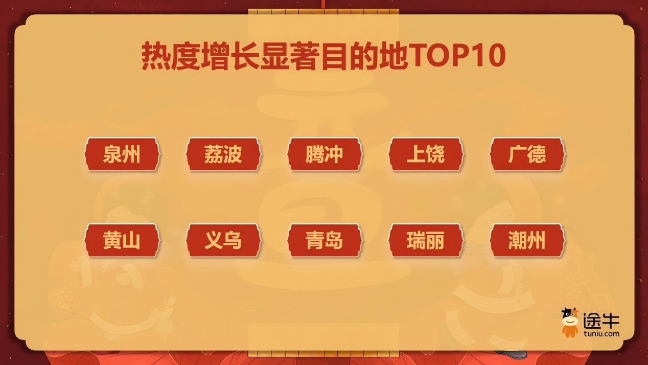 选择“就近跨年”的用户重点考虑在兼顾便捷性的同时体验节日氛围。此外,随着元旦假期的临近,一些“网红城市”及县域目的地的搜索及咨询热度也迎来了快速增长。泉州凭借簪花、古厝夜游、闽南小吃等元素吸引了更多年轻游客的青睐,近10日搜索及咨询热度环比增长超5倍;荔波、腾冲、上饶等目的地近10日搜索及咨询热度环比增长超3倍。位于江浙皖三省交界处的广德更因“广德三件套”——炖锅、奶茶、桃酥,近期在社交平台持续火爆,成为今冬旅游市场的“黑马”之一,元旦期间也将吸引不少游客专程前往打卡体验。