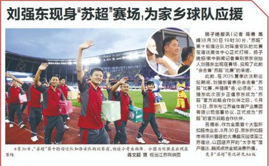 作为出身江苏的企业家,刘强东与这片土地之间,始终流淌着一种血脉相连的亲近。今年8月30日,2025江苏省城市足球联赛宿迁对阵淮安的比赛在宿迁奥体中心打响。赛前,在现场采访的扬子晚报记者惊喜地拍到刘强东现身看台,兑现了“会来看‘苏超’比赛”的承诺。那一刻,他不是叱咤商海的“刘总”,而是为家乡球队加油助威的普通观众。