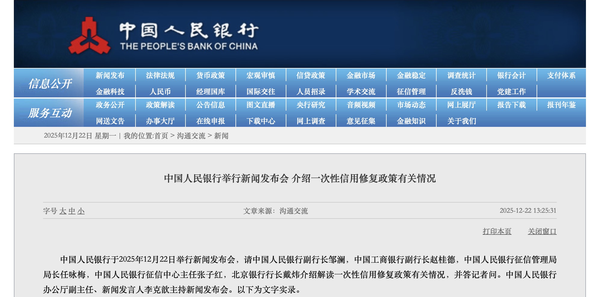 12月22日,中国人民银行发布关于实施“一次性信用修复政策”有关安排的通知,并举行新闻发布会介绍有关情况。政策明确,为支持信用受损但积极还款的个人高效便捷重塑信用,2020 年 1 月 1 日至 2025 年 12 月 31 日期间单笔不超 1 万元的逾期信息,若 2026 年 3 月 31 日前足额还款,征信系统将不予展示,且实行 “免申即享” 无需个人申请。