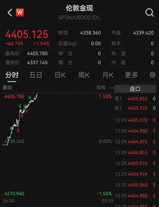 12月22日,国际金价。截至13时30分,COMEX黄金突破4430美元关口,最高触及4437.3美元/盎司,最大涨幅1.14%;伦敦现货黄金突破4400美元大关,最高触及4405.78美元/盎司,最大涨幅1.55%,创下历史新高。