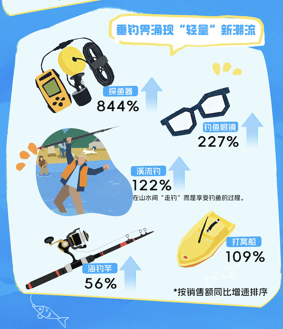 随着露营徒步等户外活动的兴起,溪流钓、小物钓等“轻量化”垂钓新趋势开始流行。报告显示,平台上溪流钓相关商品成交额同比增长122%,在城市周边、小区附近享受日常垂钓乐趣的人开始增多。与此同时,垂钓装备消费也呈现专业化趋势,平台探鱼器成交额同比增长844%,打窝船成交额同比增长109%。