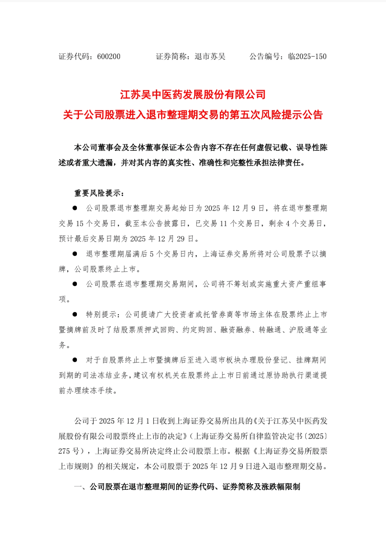12月24日,江苏吴中医药发展股份有限公司(代码:600200)发布了其股票进入退市整理期交易的第五次风险提示公告。这家自1999年登陆资本市场的老牌企业,因触及重大违法强制退市情形,其超过二十六年的A股生涯即将画上句号,预计12月29日为最后交易日。