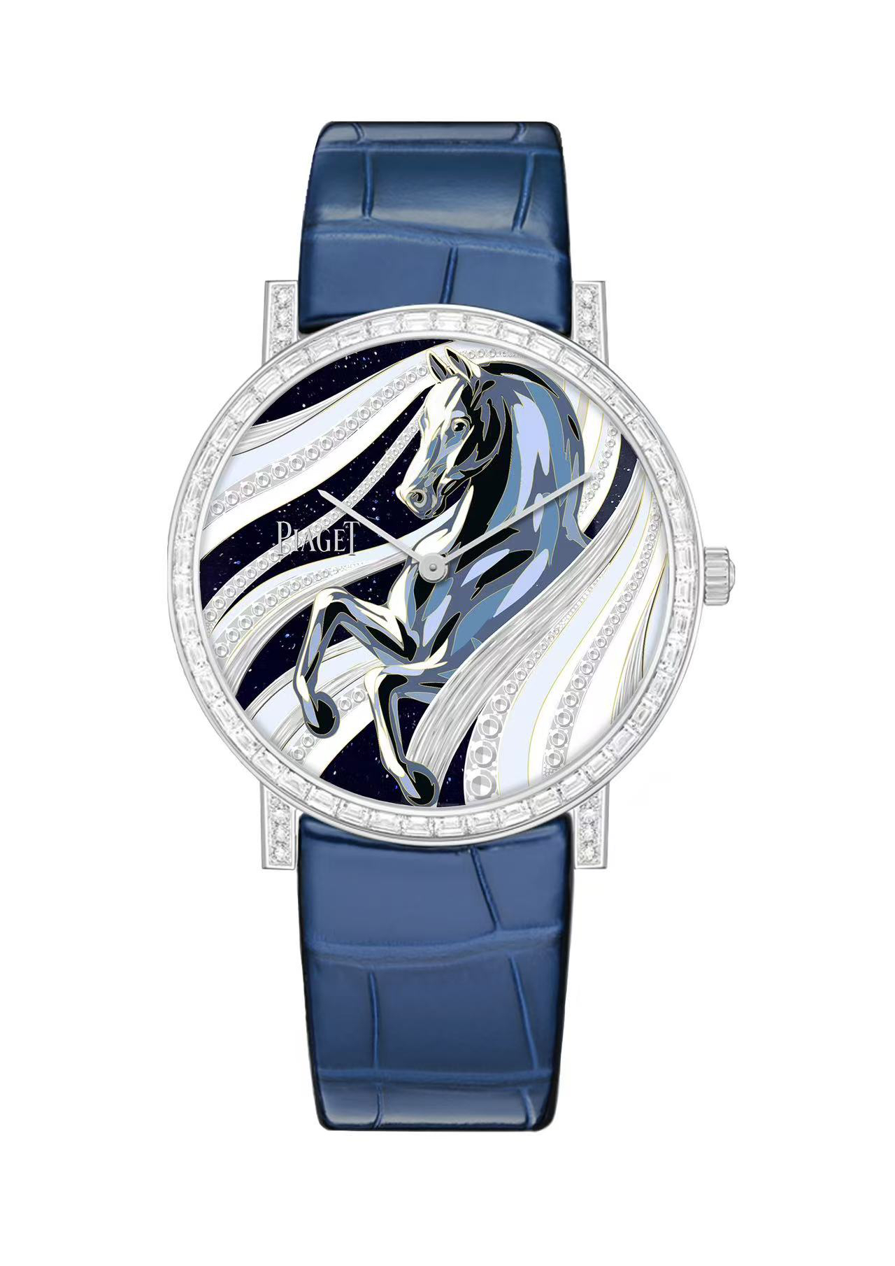 同样以“马年”为主题,伯爵选择与珐琅大师Anita Porchet合作,在Altiplano超薄系列腕表上,运用手工雕刻、掐丝珐琅与钻石镶嵌等多重工艺,在白金表盘上塑造出蓝白渐变的灵动骏马,限量18枚。伯爵的策略明确:将中国生肖主题置于其最核心的“大师工艺”框架内演绎,以此证明其卓越技艺足以驾驭任何文化主题,并使之升华为艺术。