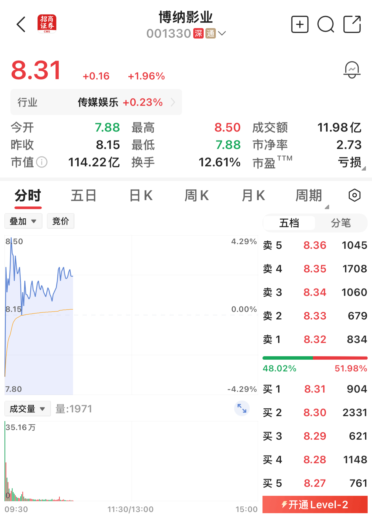 今日早盘,截至发稿时,博纳影业今日止跌,上涨1.96%。