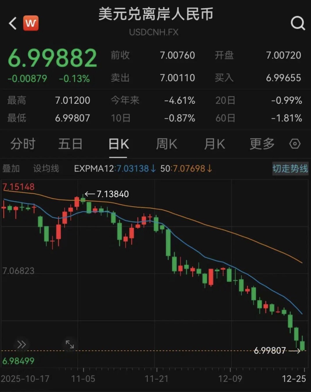 12月25日,离岸市场人民币汇率持续走强,升破7.0大关,为2024年9月以来首次;在岸人民币最高升至7.0061,美元指数跌破98。多家机构认为,2026年人民币有望继续升值。人民币“更值钱了”,对普通人来说,出国旅游、留学、海淘更省钱了。