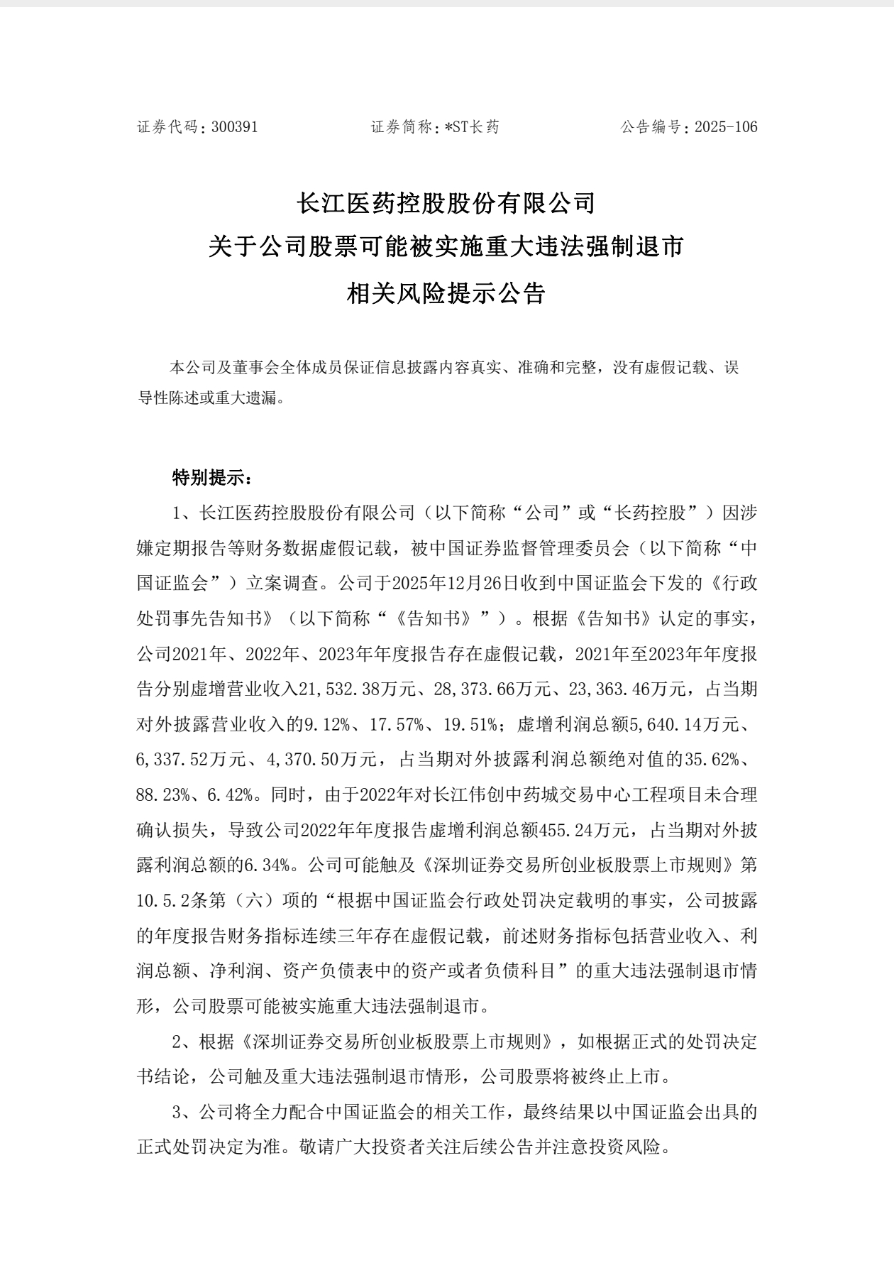又一家上市公司因财务造假或走向退市终局。*ST长药(300391)因连续三年虚构收入、利润,被证监会重罚,并启动强制退市程序,成为年内第15家触及重大违法退市红线的公司。