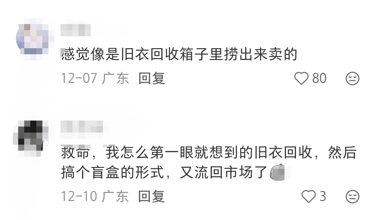 引发热议的连衣裙盲盒,以随机款式、包邮特价为核心卖点,有些商品页面描述中明确“无主图款”,其意味着实际到货没有宣传图所展示的成品,宣传图可能是商家用作引流的工具。从反馈来看,消费者体验呈现两极分化:少数人将其视为低成本娱乐,但更多消费者遭遇货不对板,收到的衣物多为老旧款、中老年款式,甚至存在污渍霉点、刺鼻异味等问题。这类衣服货源多为批量回收的二手货、瑕疵品,未经清洗消毒便直接打包售卖,存在极大健康隐患;同时几乎没有什么售后保障,商家多以盲盒不退不换为由拒绝处理质量问题,退货运费也远超盲盒本身价格,维权成本较高。
