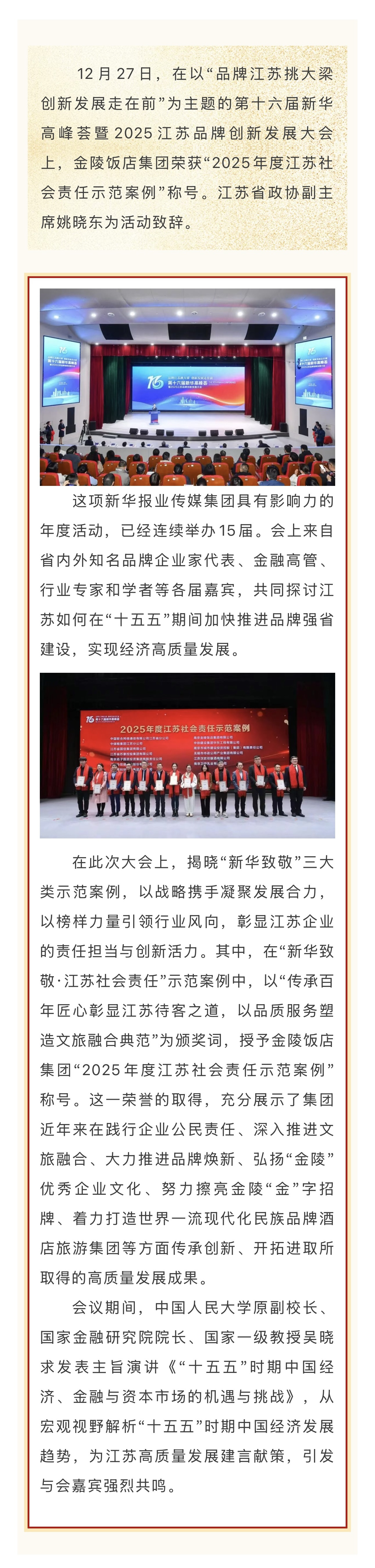又有喜报!金陵饭店集团获评“2025年度江苏社会责任示范案例”