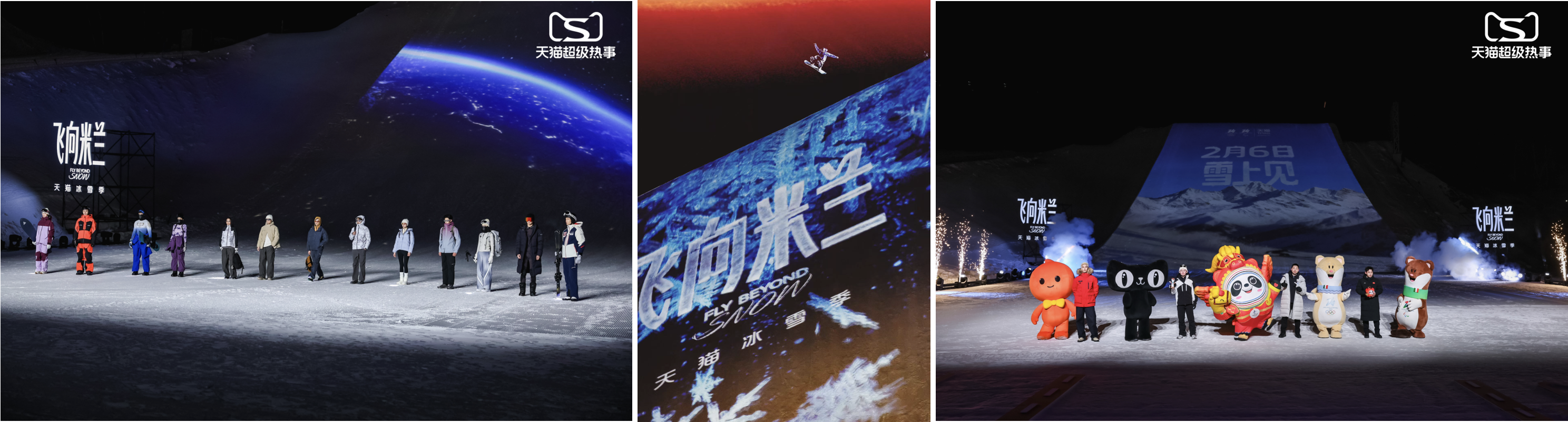 实际上,天猫正在这里打造一场盛大的冰雪季活动——以“飞向米兰”为主题,采用了雪域到米兰的三部曲设定,不仅是秀场创意,也是对中国冰雪产业升级路径的精妙隐喻。在飞行的最高点,指向终极目标米兰,现实呈现了“从中国冰雪消费通向2026米兰冬奥的灵感与潮流中转站”的定位。