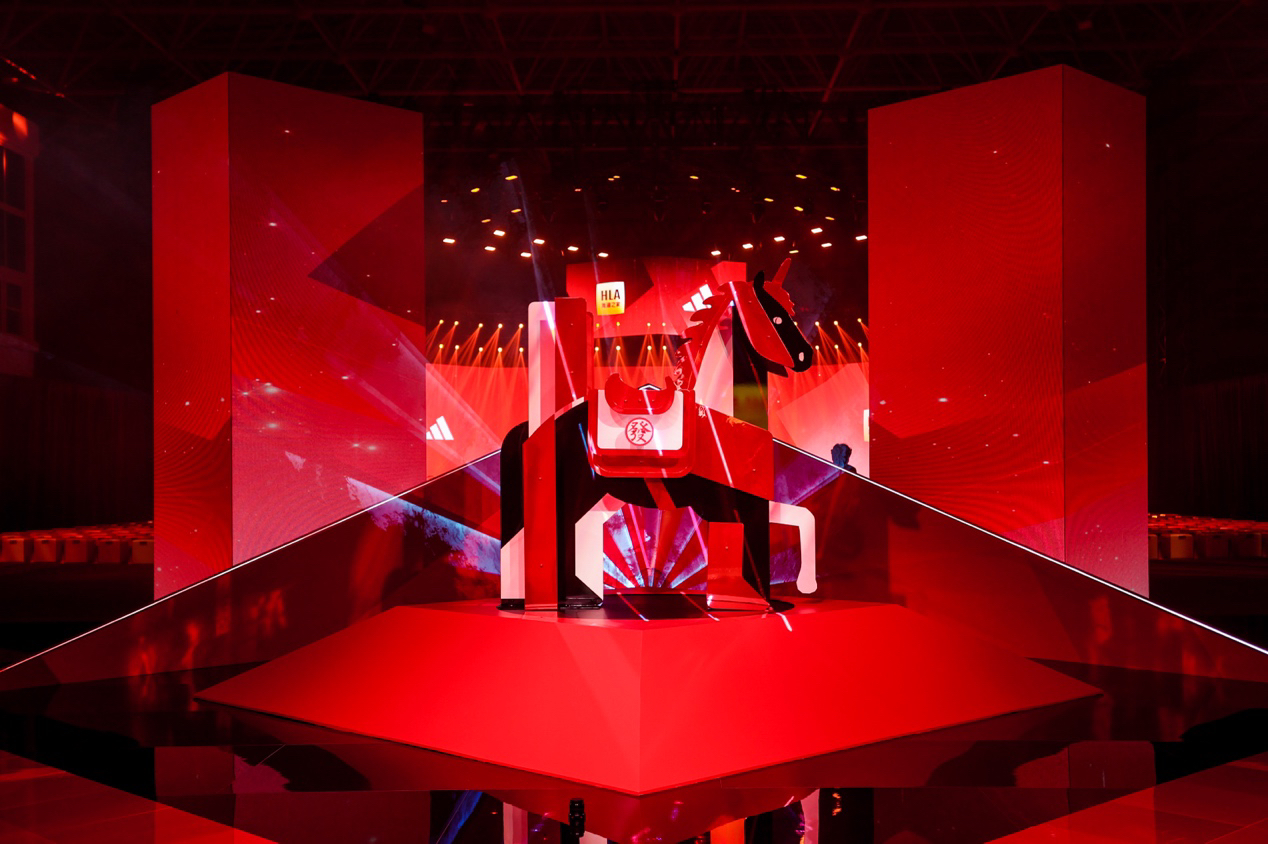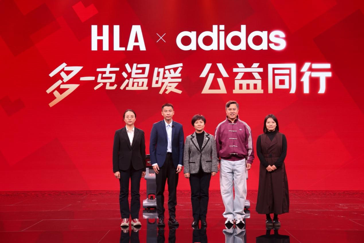 发布会现场,双方推出了以农历马年为主题、融合东方美学与运动基因的 HLA x adidas 马年新春合作纪念版卫衣,设计以昂扬的“马”为核心图腾,将“龙马精神”的文化内核注入现代潮流,寓意新年一马当先、奋进向上。