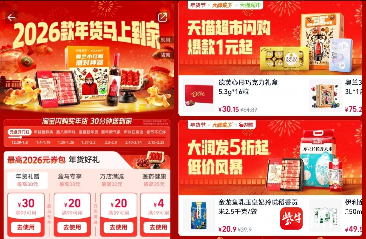 基于这一洞察,淘宝闪购年货节于12月底提前开启,通过整合盒马鲜生、天猫超市的优质商品供给,并联合大润发、沃尔玛等大型连锁商超,百果园、酒小二、吉列等知名品牌,共同推出多款新年节日爆款及冬季时令大单品。智利车厘子、红颜草莓礼盒、鲜活波士顿龙虾、澳洲和牛肥牛卷、榴莲千层等品质食材,以及“马上有钱”银柳福桶、新年玫瑰花束等节庆好物悉数上线,覆盖送礼、聚会、节日布置等多元场景,消费者30分钟即可一站式购齐所需年货。