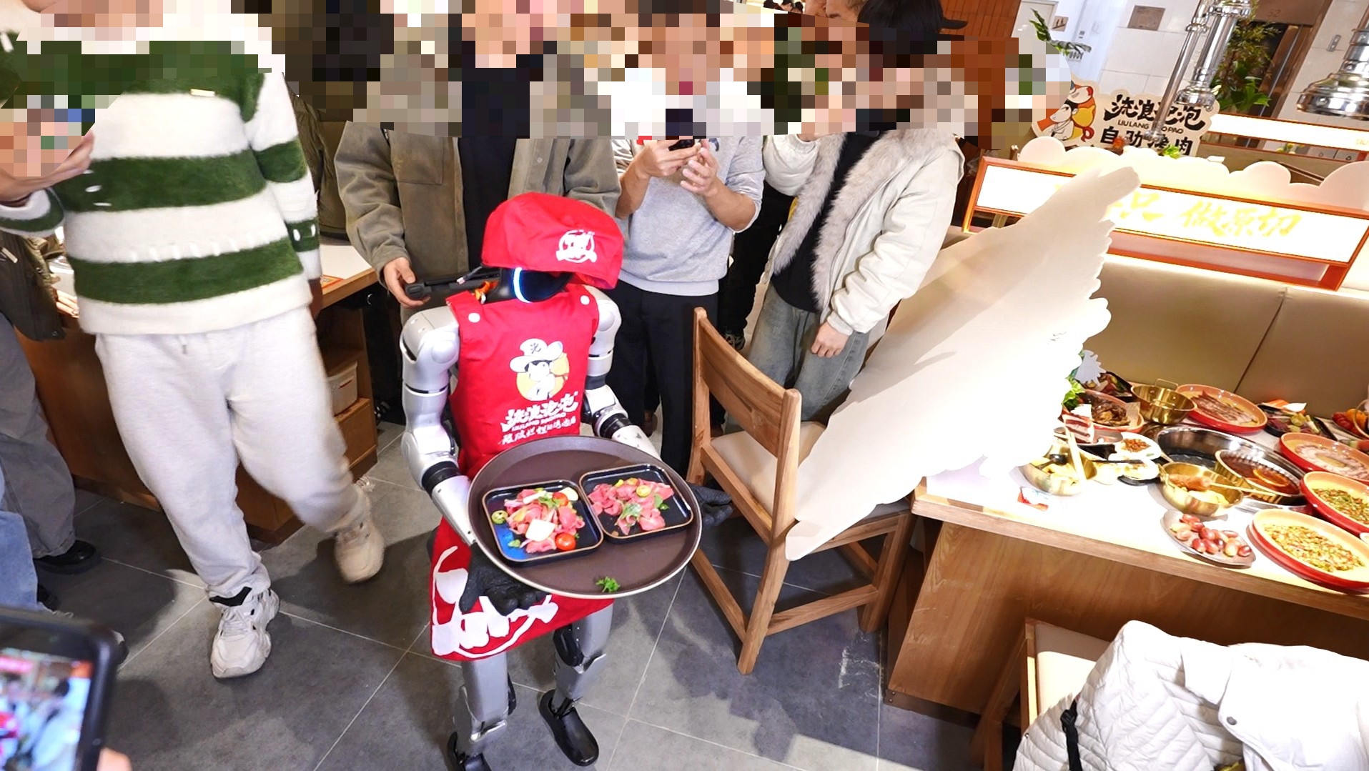 2026年开年,自助烤肉品牌流浪泡泡正式登陆杭州。城西银泰、金沙天街双店同步启幕,单店日均取号超1200组,峰值客流破5000人次,迅速登顶本地餐饮热门榜。当日,来自杭州本土企业宇树科技的人形机器人以“杭州限定店员”身份入职门店,不仅承担迎宾、送餐功能,还会定时上演舞蹈表演,更换上白娘子、许仙造型与IP人偶组队巡游,科技感与杭州传统文化的碰撞引发百万级传播。