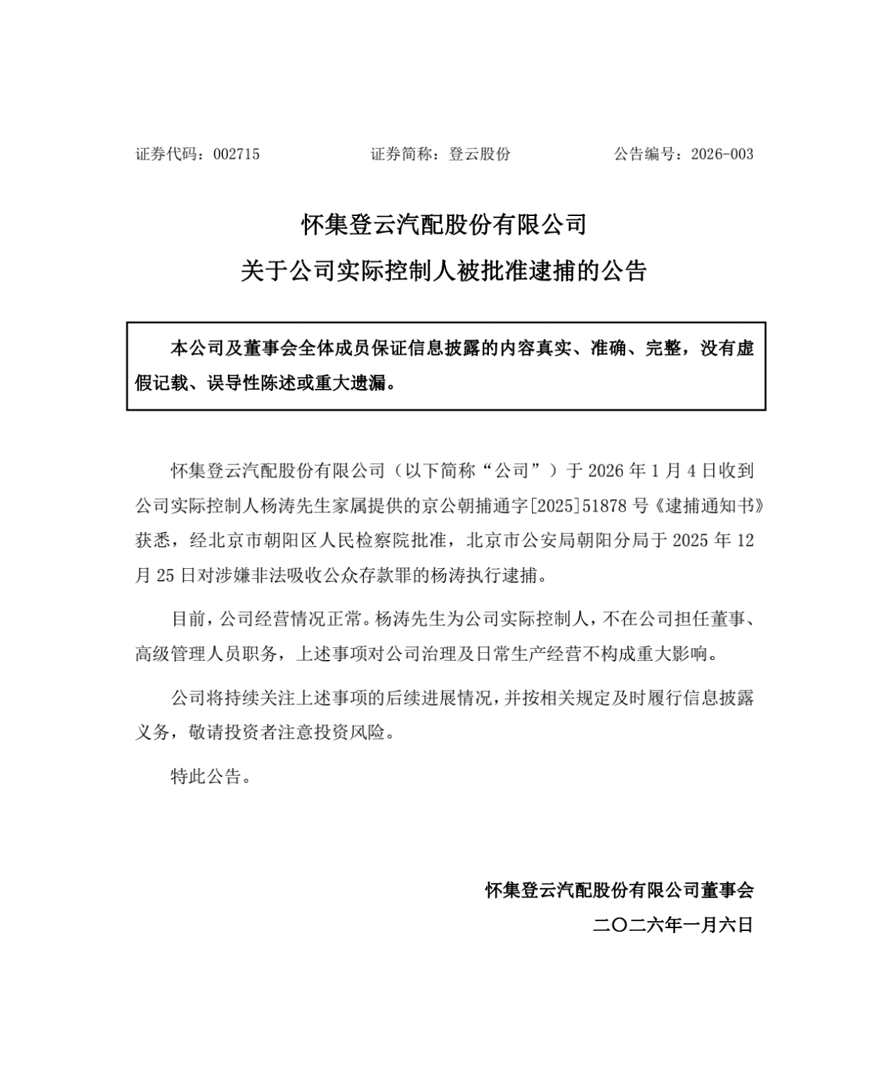 就在前一晚,登云股份发布公告,公司实际控制人杨涛因涉嫌非法吸收公众存款罪,已被北京市公安局朝阳分局执行逮捕。