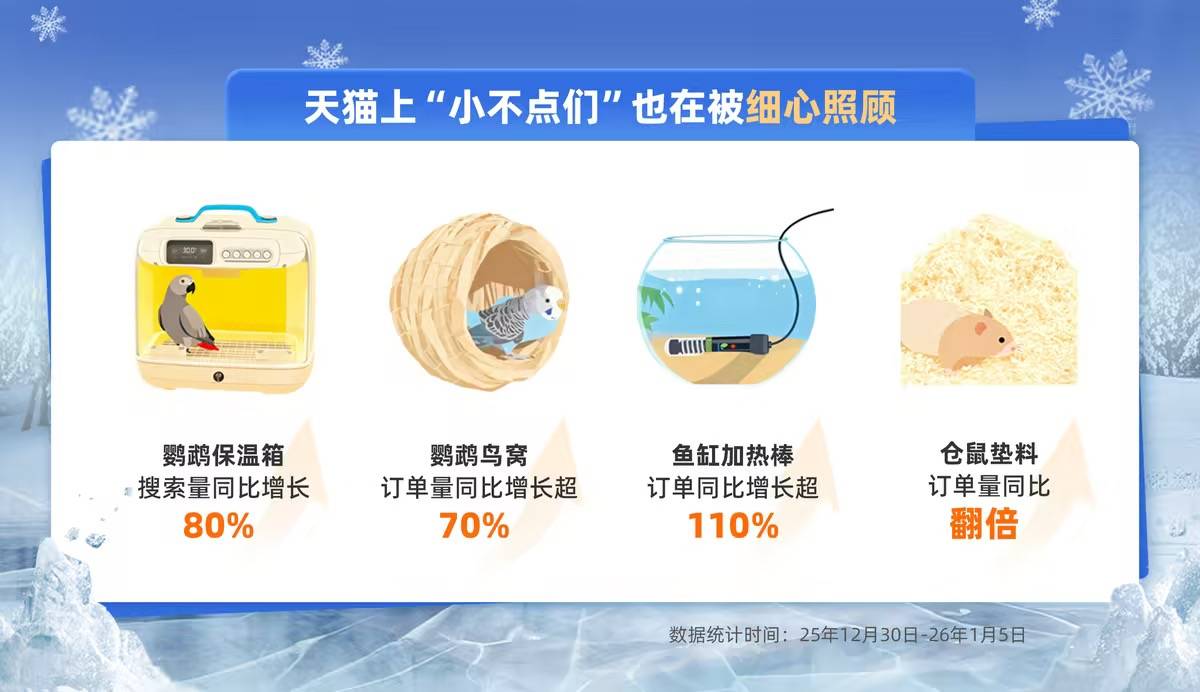 被细心呵护的远不止猫狗。面对低温,仓鼠、鹦鹉、斗鱼等“小不点们”也得到了科技与细心的双重保障。天猫数据显示,鹦鹉保温箱搜索量同比增长80%,鹦鹉鸟窝订单量同比增长超70%,陶瓷加热灯、温控站杆等专业设备密集上市,让主人不必在“怕它冷”和“怕它应激”间艰难取舍。鱼缸加热棒订单同比上涨超110%,观赏鱼在冬日也能徜徉于“恒温泳池”。仓鼠主人精心搭配纸棉、木屑等垫料,建造温暖巢穴,卡诺仓鼠垫料订单量同比翻倍。