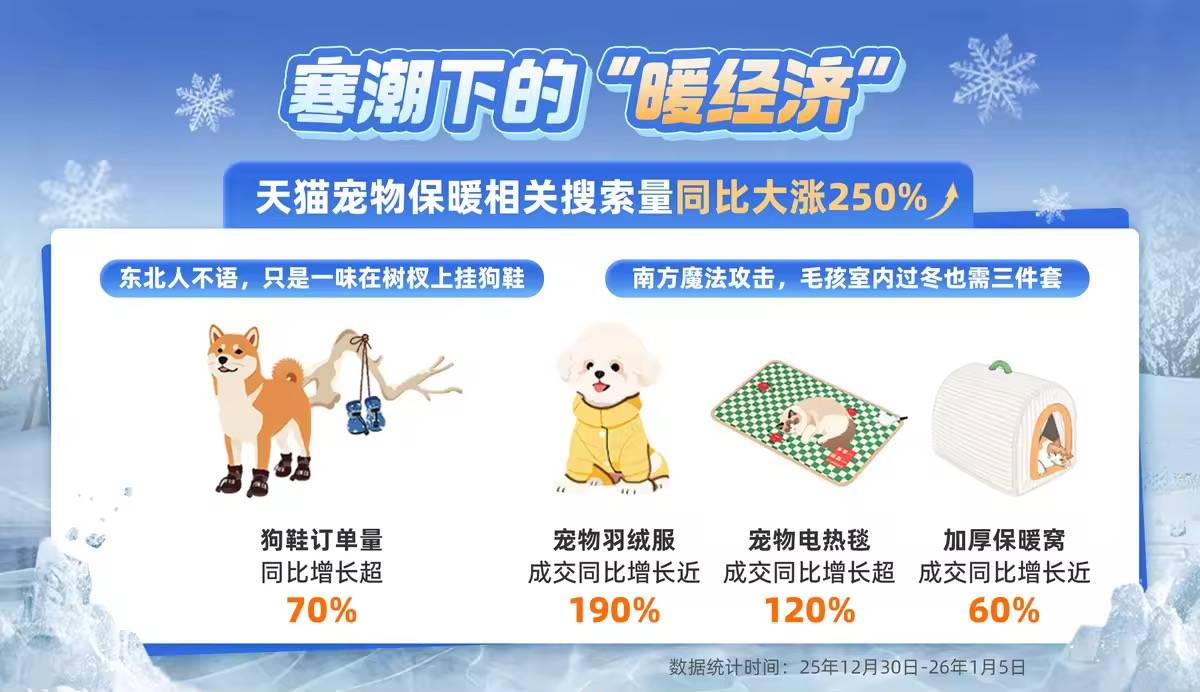 随着2026年首轮寒潮自北向南席卷,从新疆到云南,多地相继拉响降温警报。天猫数据显示,过去一周,宠物保暖相关搜索量同比大涨近250%。当人们翻出厚重冬装时,家里的毛孩子也迎来了年度保暖大考。