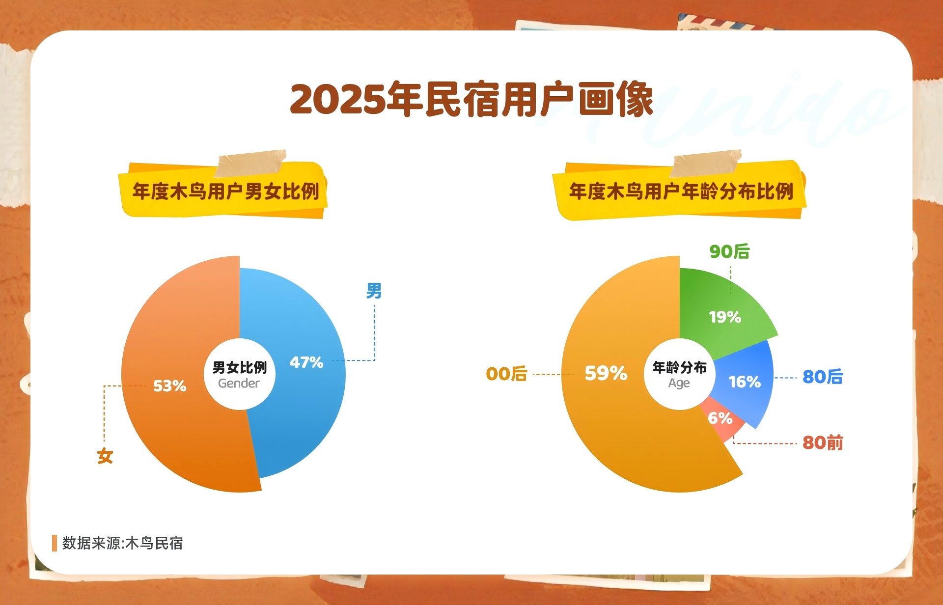 报告显示,2025年木鸟民宿女性用户订单占比为53%,女性用户人均民宿消费比男性高出23%,她们更追求个性化、独特的旅行体验。从年龄上看,00后用户占比为59%,90后用户占比为19%,80后用户占比为16%,80前用户占6%。00后占比近六成,成为民宿消费的核心力量。