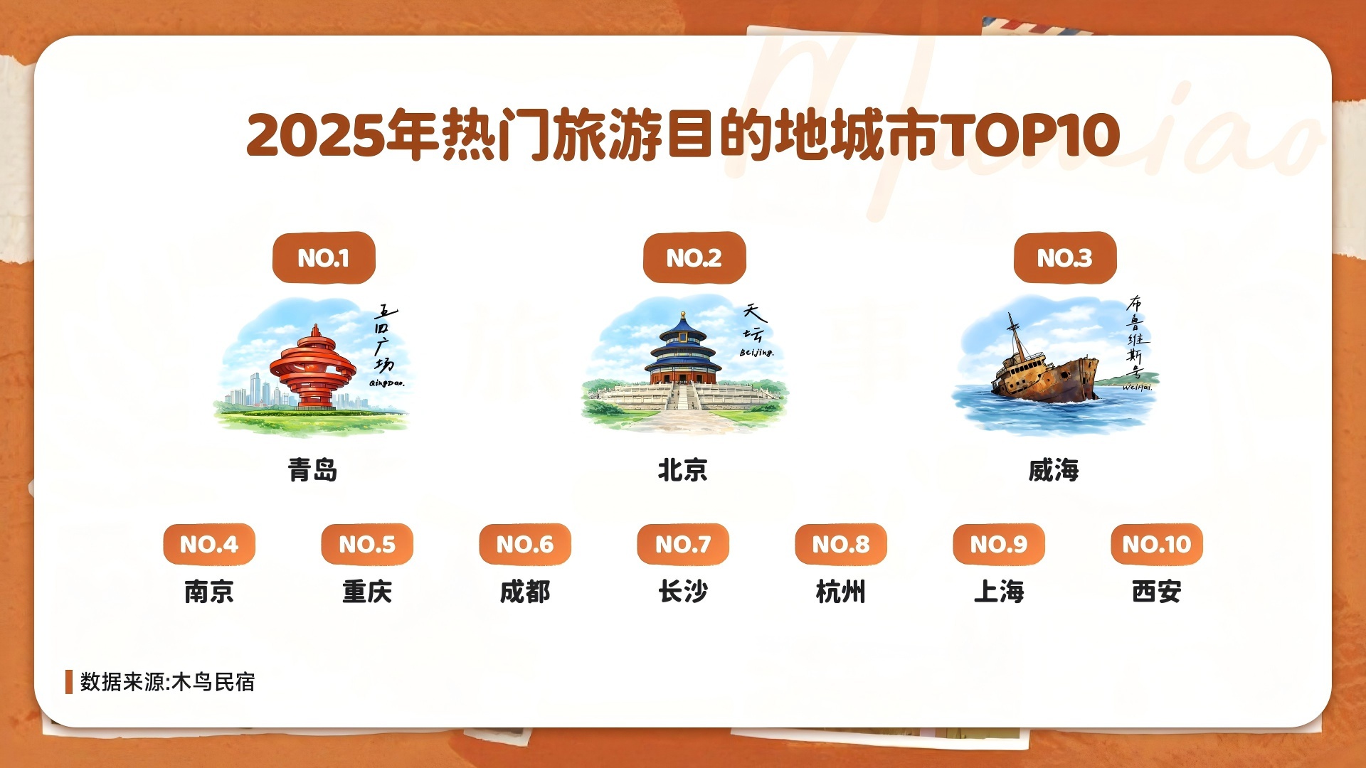 报告显示,2025年最受欢迎的10个民宿消费目的地依次为:青岛、北京、威海、南京、重庆、成都、长沙、杭州、上海、西安。受苏超带动,南京成为木鸟民宿今年搜索和咨询量最高的城市,徐州全年民宿订单同比增长122%。其中,TOP100热门目的地中,开封、防城港、乌鲁木齐、清远、贵阳、连云港、徐州、日照、陵水、柳州成为增速最快的十大目的地,开封全年订单增速达4.6倍。